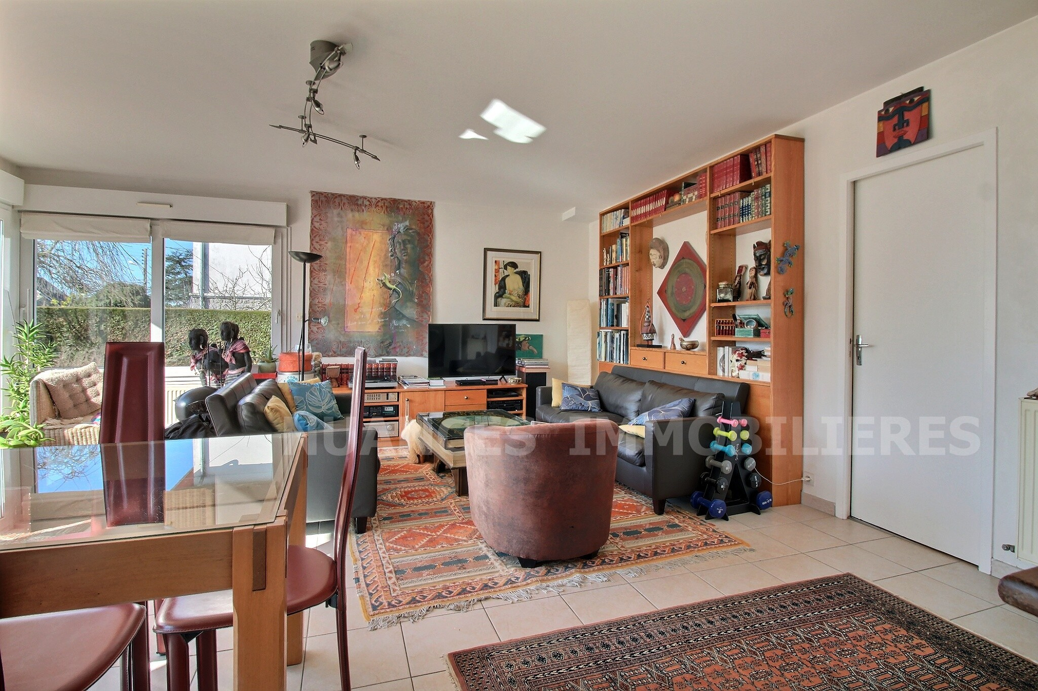 -Rez de chaussée : une entrée, un séjour de 32m2 parfaitement exposé ouvrant la terrasse et le jardin clos et arboré, une cuisine aménagée séparé ouvrnat sur la terrasse, puis une chambre et salle d'eau, wc.