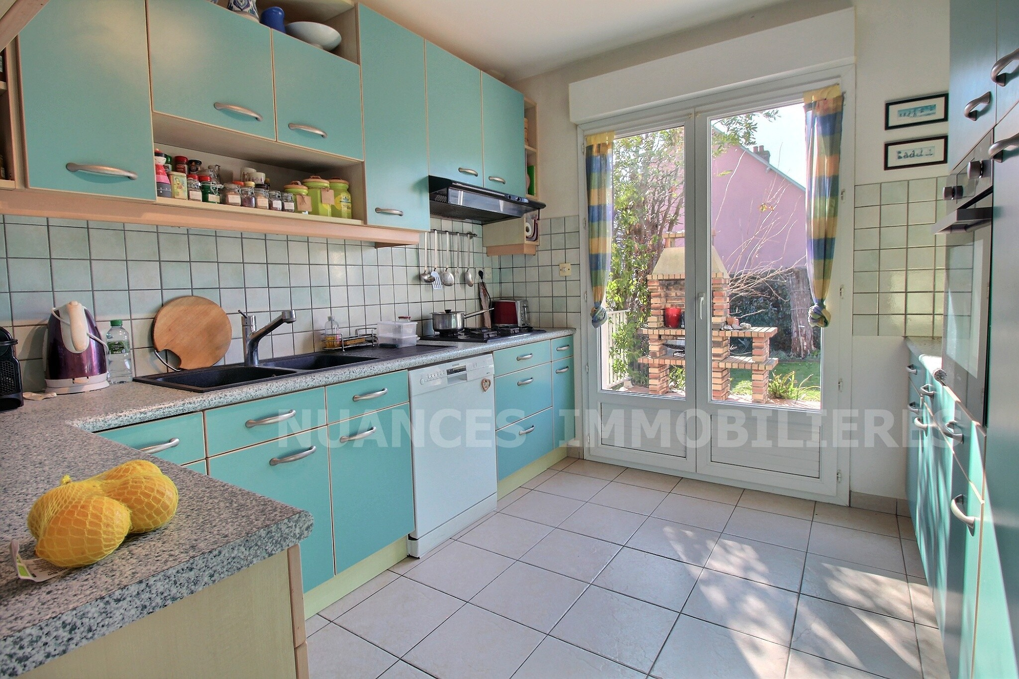 -A l'extérieur : Une terrasse carrelée, un barbecue en dur, et un jardin clos entourant la maison.