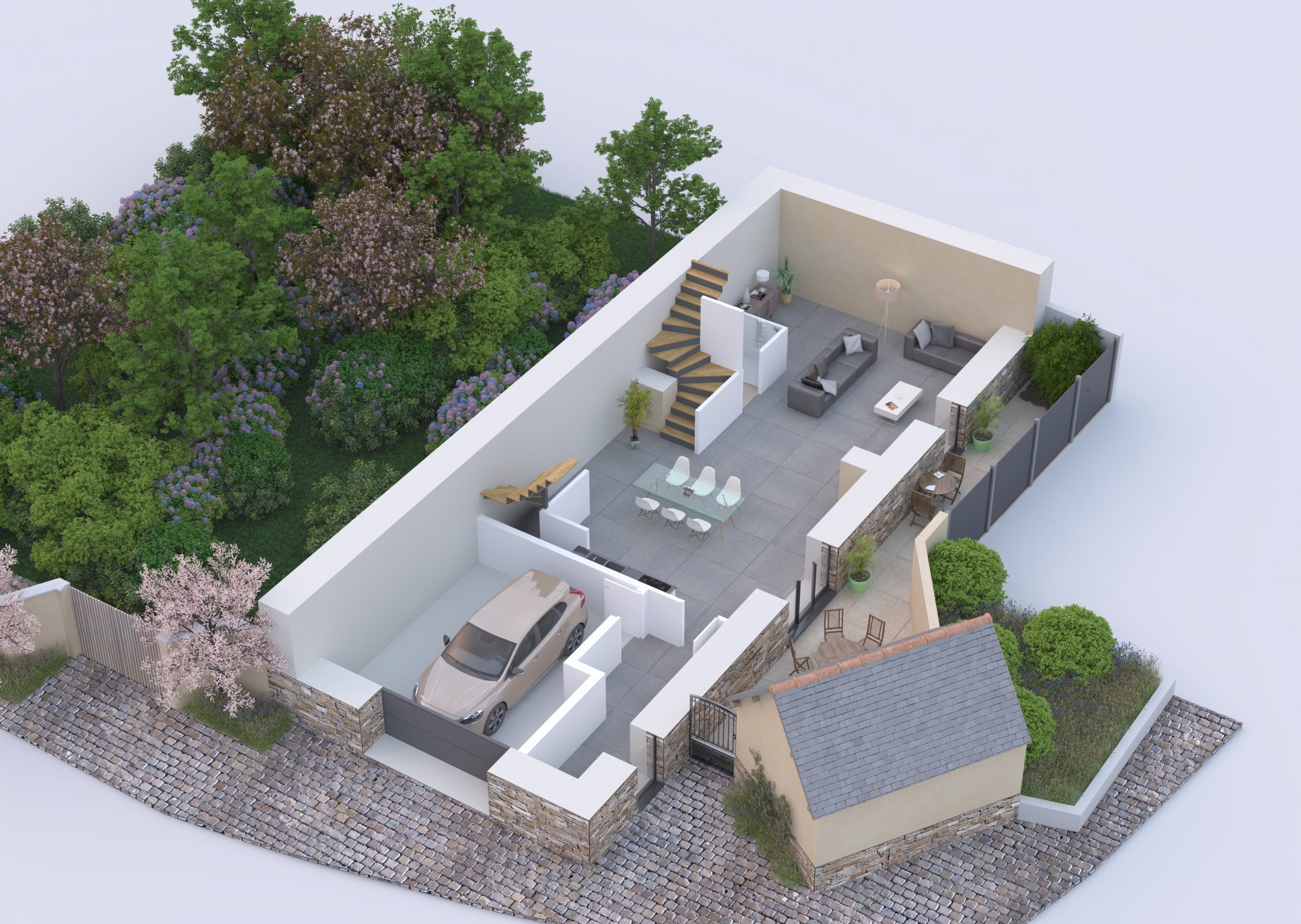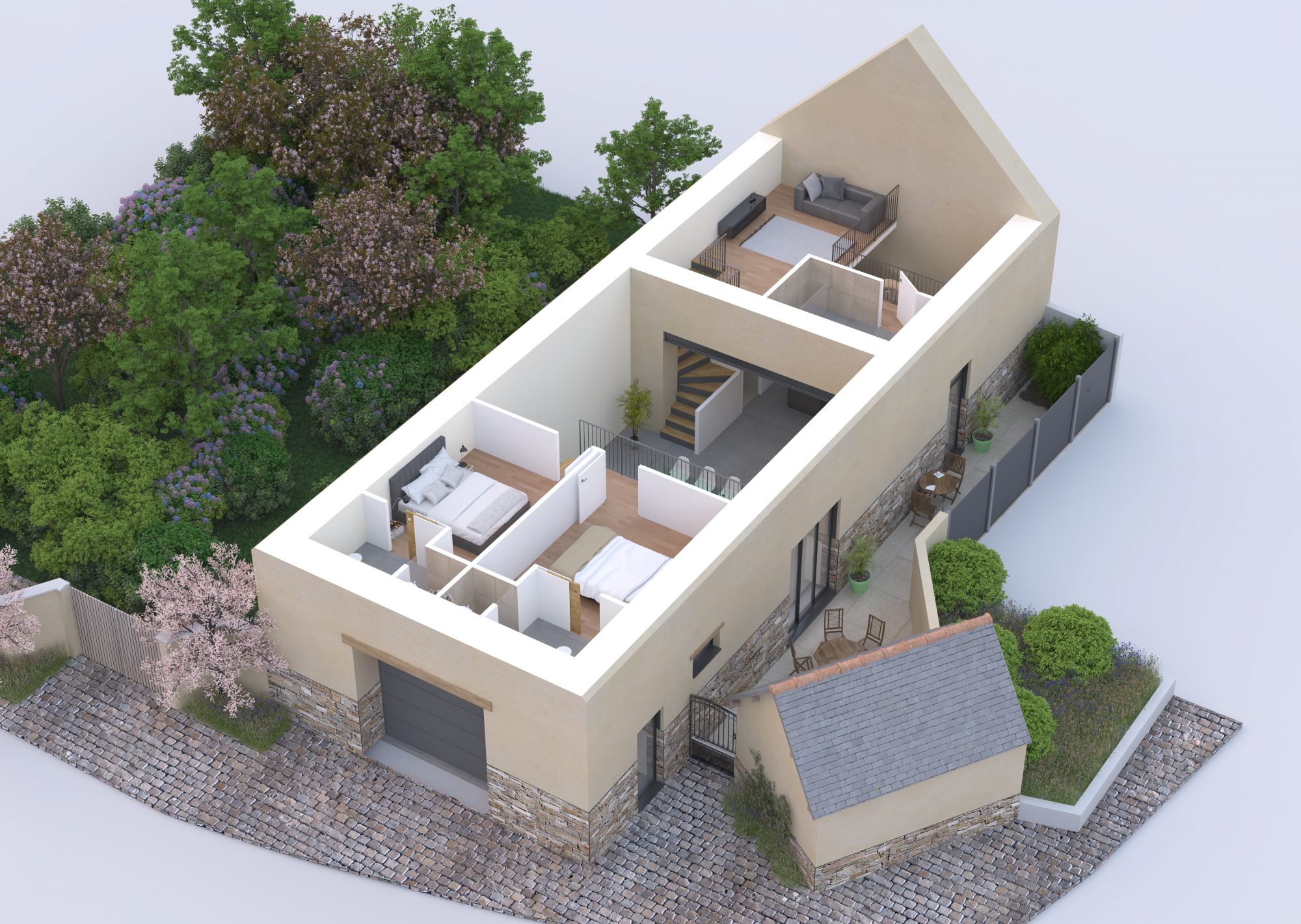 Un permis a été déposé pour sa rénovation, permis qui peut être repris en l'état ou modifié en en faisant la demande en mairie. La configuration et le permis déposés prévoient la création d'un garage accessible en pignon, d'un vaste espace de vie au RDC et de 2 ou 3 chambres à l'étage. Les plans actuels proposent 150m² de surface habitable environ.