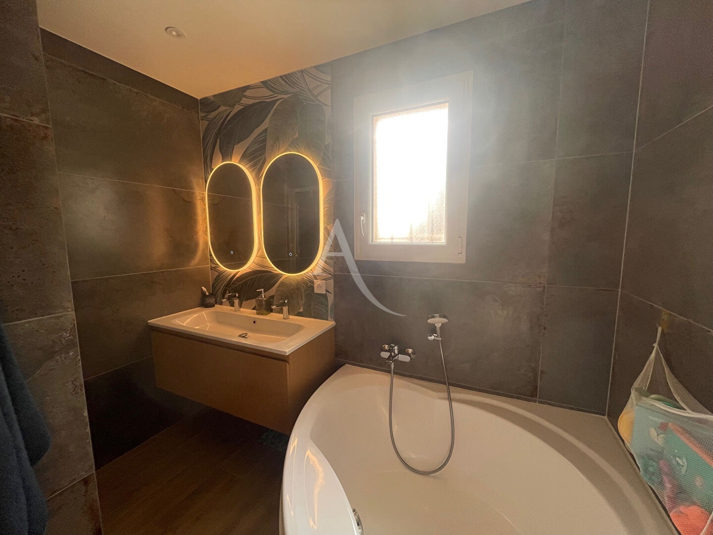 Elle possède en Rdc, une véranda, un grand salon séjour, une cuisine aménagée/équipée, un wc, puis à l'étage 4 Chambres, une salle de bains avec douche et wc. Un T2 avec salon ouvert sur cuisine aménagée, une salle d'eau, un wc, une chambre et une terrasse privative.