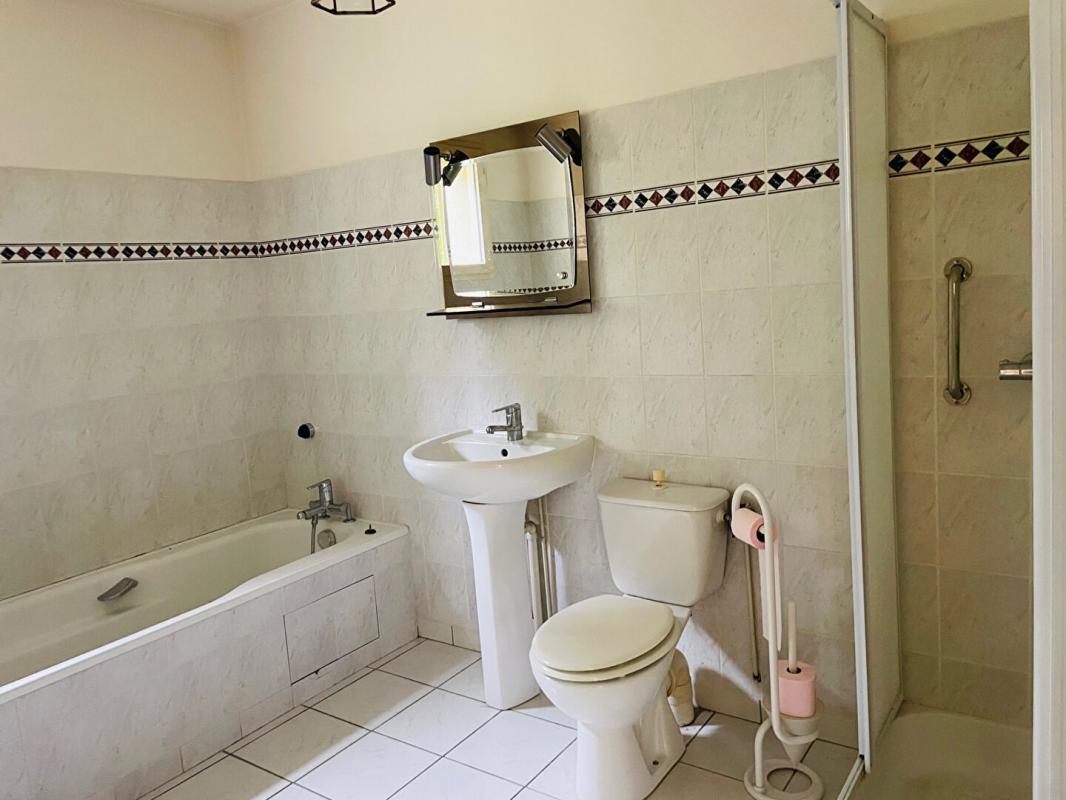 La maison se compose d'une pièce de vie traversante de 47m2 qui bénéficie d'une cheminée à foyer ouvert et une cuisine semi ouverte de 12m2. Au rez de chaussée, vous trouverez également une belle chambre de 12.5m2 avec une très grande penderie ainsi qu'une salle de bain avec baignoire et douche et wc séparé.