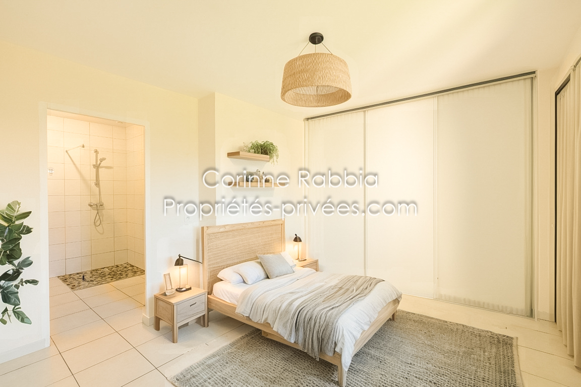 Le rez-de-chaussée comprend un espace de vie climatisé de 35m² lumineux grâce à son exposition sud et ses deux baies vitrés, sans vis-à-vis, agrémenté d'une cuisine ouverte aménagée et partiellement équipée. Une suite parentale avec salle d'eau et WC indépendant complète ce niveau. L'étage dessert deux chambres de 14m² chacune, dotées de placards intégrés et de climatisation individuelle, une salle de bain et un WC séparé.