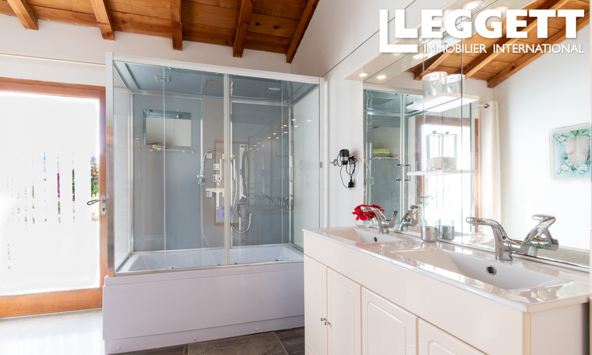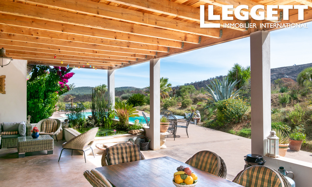 Une terrasse couverte de 60 m² permet de profiter de la douceur du climat toute l'année. S'ajoutent un garage double de 100 m², buanderie, dressings, sauna, poêle à bois et à granulés, eau de source filtrée et fosse septique certifiée.