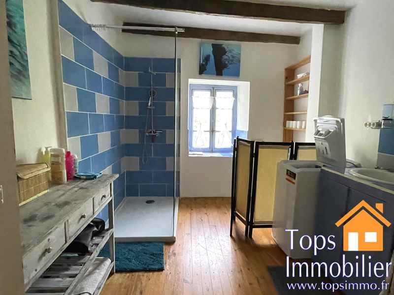 On entre directement dans la pièce de vie, avec salle à manger et cuisine de 35 m2. Le salon de 22 m2 donne à l'arrière sur une terrasse de 15 m2. La chambre et la salle d'eau font chacune 9m2. A l'étage, avec beaucoup de charme, une grande pièce mansardée de 25 m2 sert de chambre.