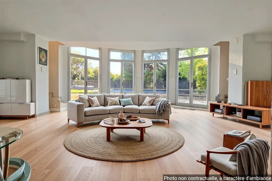 Au rez-de-jardin : superbe pièce à vivre de 44 m2 à l'esprit Art Déco, très lumineuse grâce à avancée vitrée façon bow-window ouvrant sur la terrasse, chambre avec accès jardin, salle de bain-WC, pièce avec sauna, pièce d'appoint, WC, chaufferie, garage.