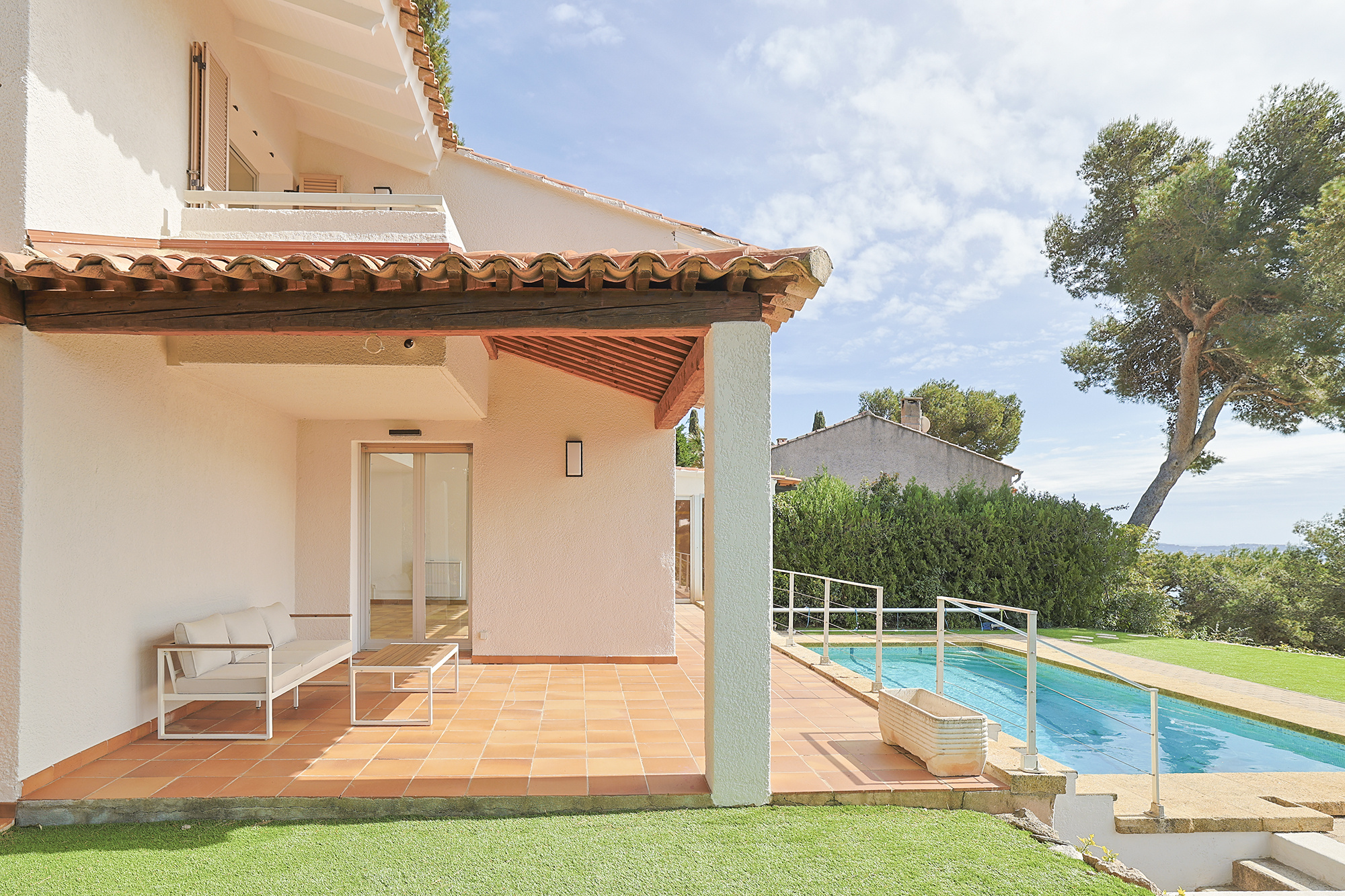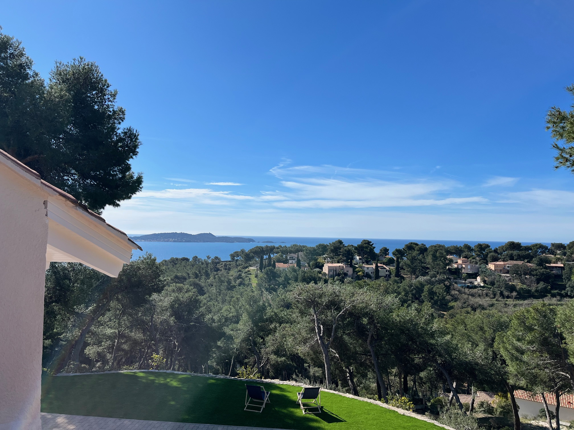 HYERES, QUARTIER TRES RESIDENTIEL, superbe villa d'architecte de 223m2 habitables env.plus annexes, sur un terrain de 1867m2 arboré. Trés belle vue dominante mer et entourée de verdure, elle est enveloppée dans la nature et au calme. Piscine sans vis a vis. La propriété offre de beaux volumes et une trés belle vue dégagée sur la verdure environnante et la mer. Elle se compose de 3 chambres dont deux vue mer et une ouvrant sur une tropézienne, un bureau, une mezzanine, des combles aménagés, et dépendances, le tout idéalement situé non loin des plages de Hyères et Carqueiranne, garage double, nécessite des travaux de rafraîchissement intérieur.