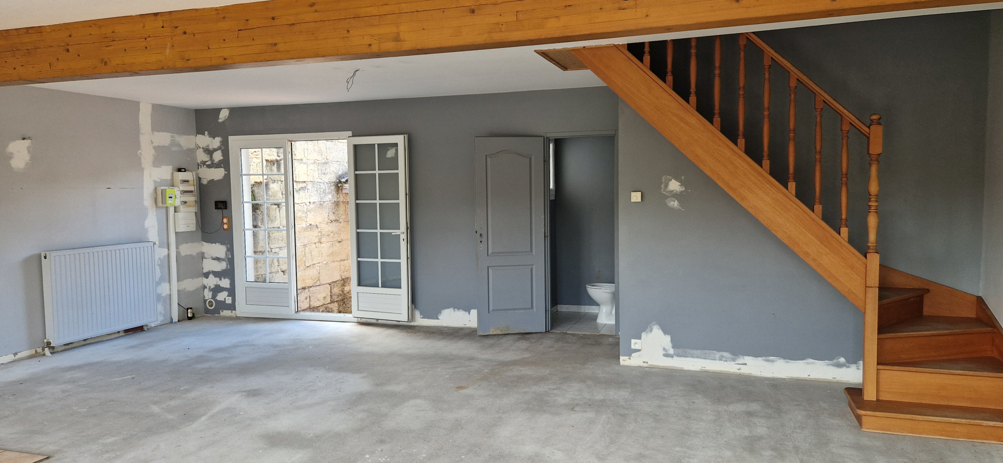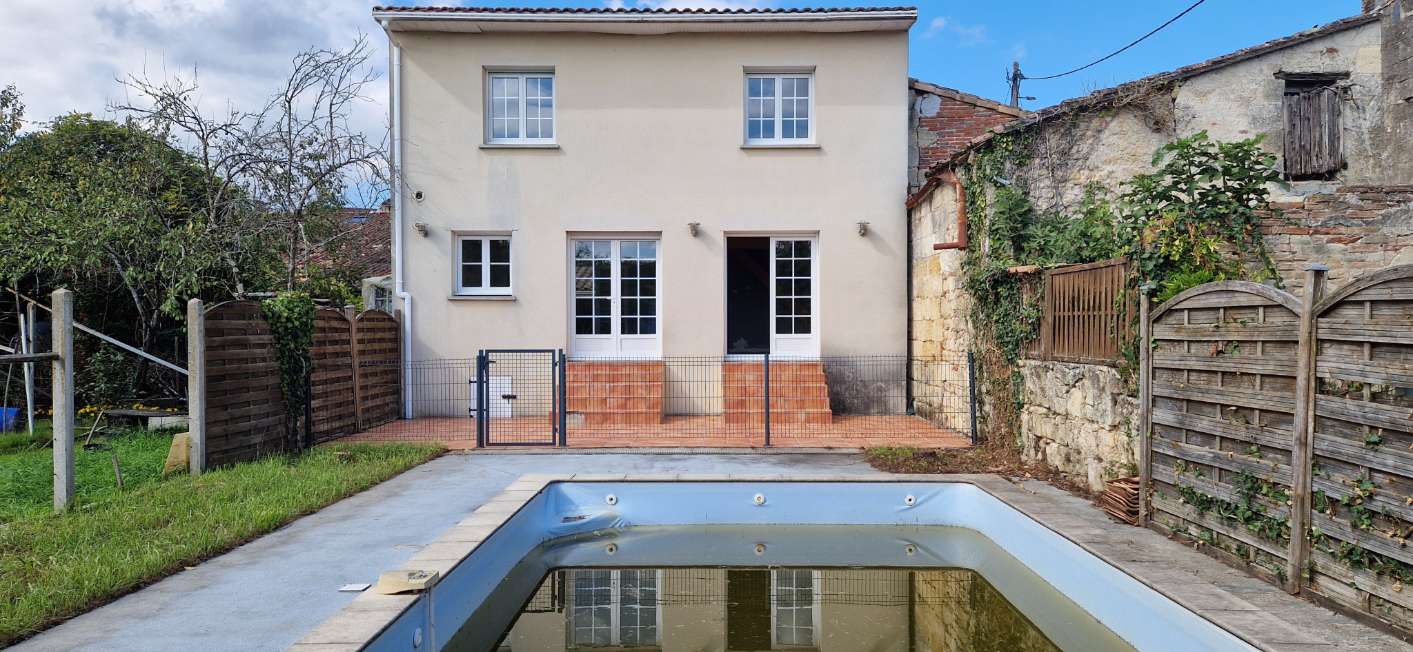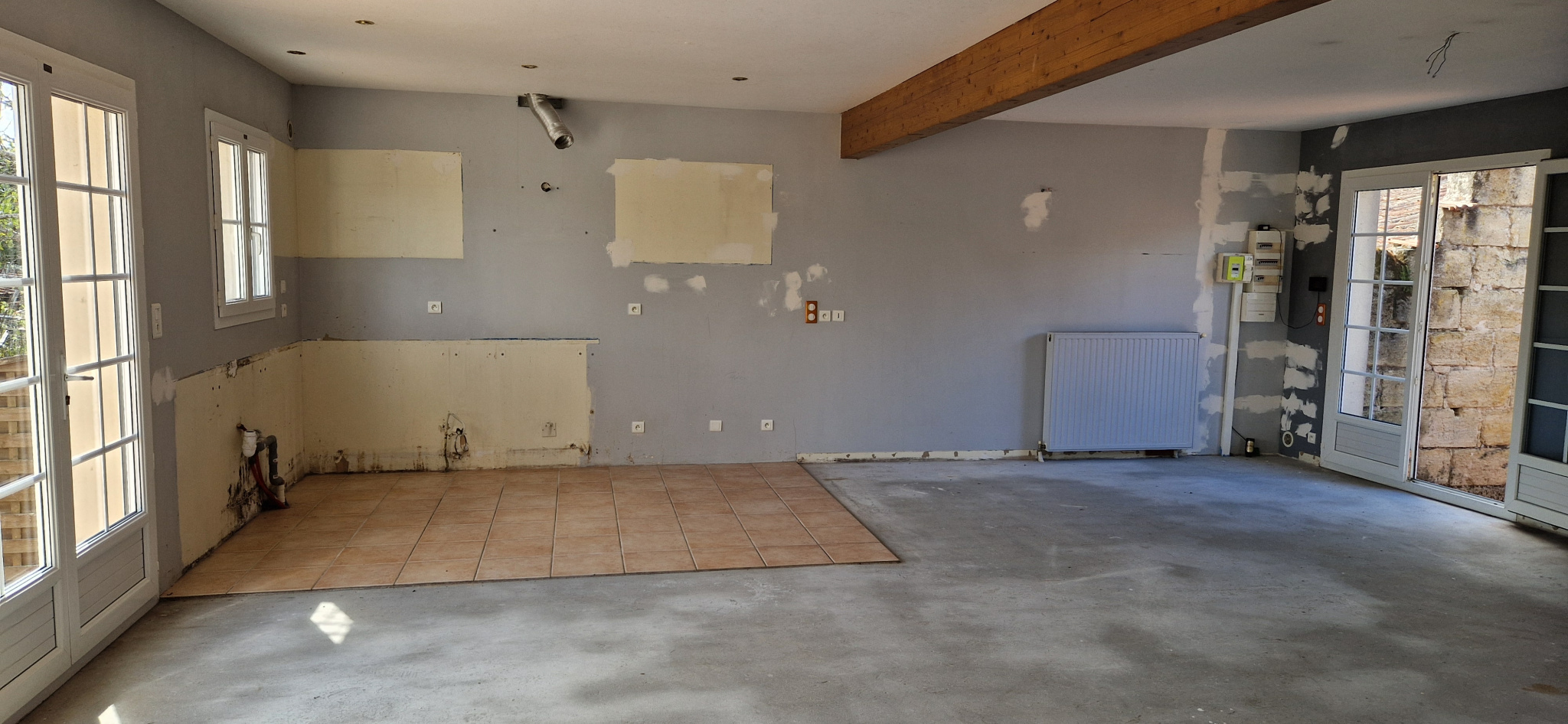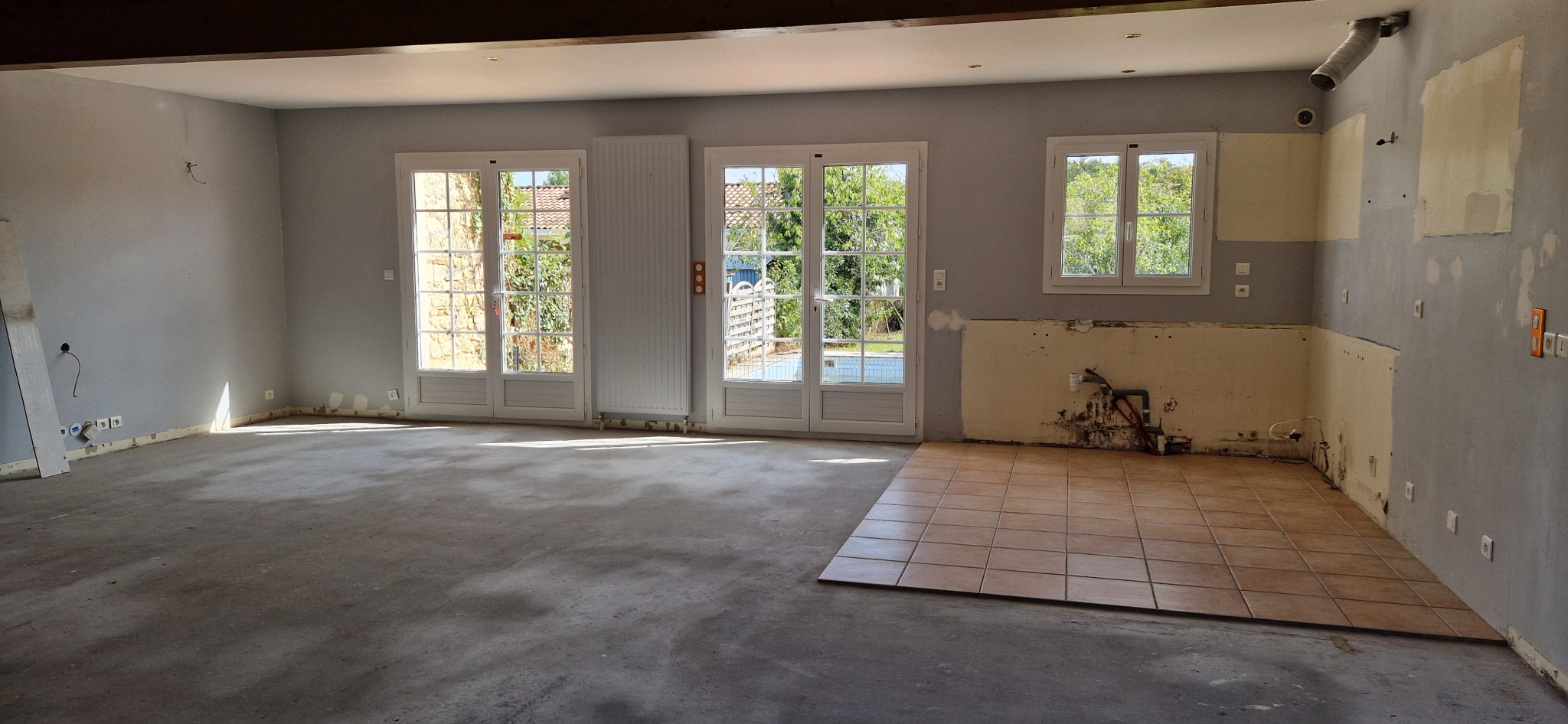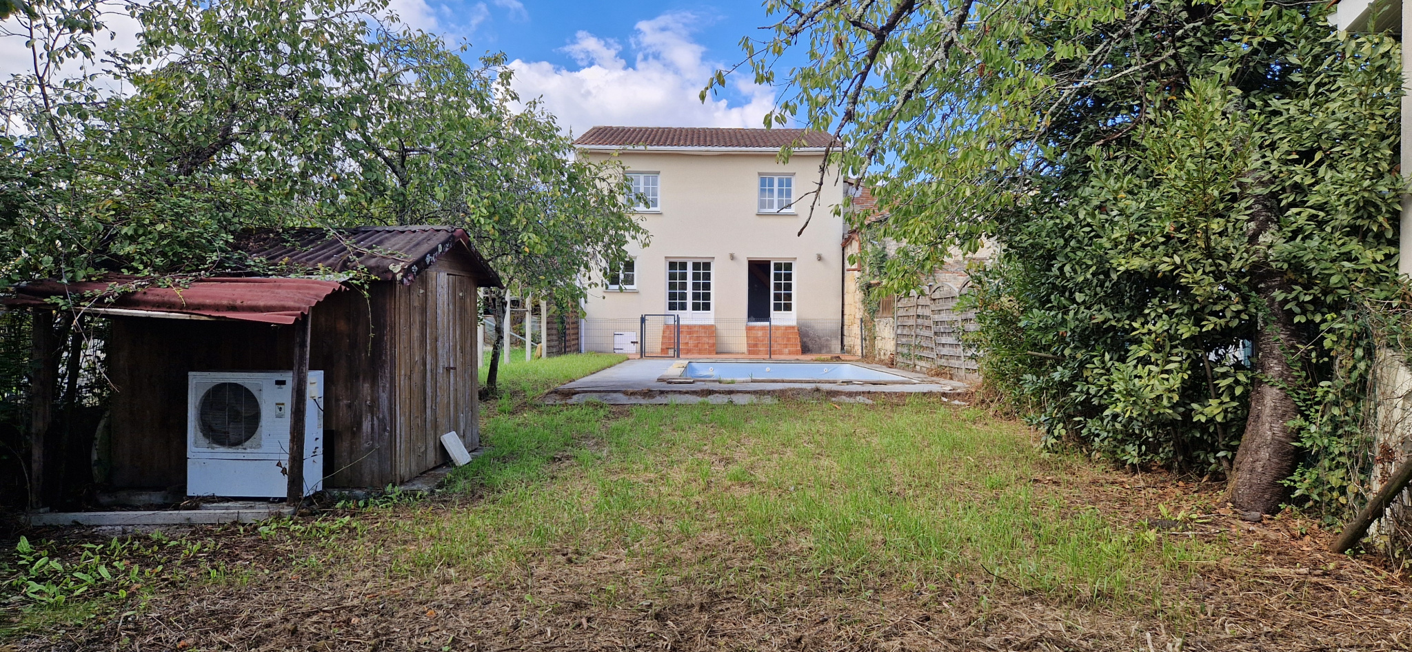 maison sur vide sanitaire de 120 m2 comprenant, un séjour cuisne, une salle de bains, WC, un palier, quatre chambres et WC, grand garage de 77 m2 plus préau ancien attenant carrelé de 50 m2, terrasse, piscine et jardin autour