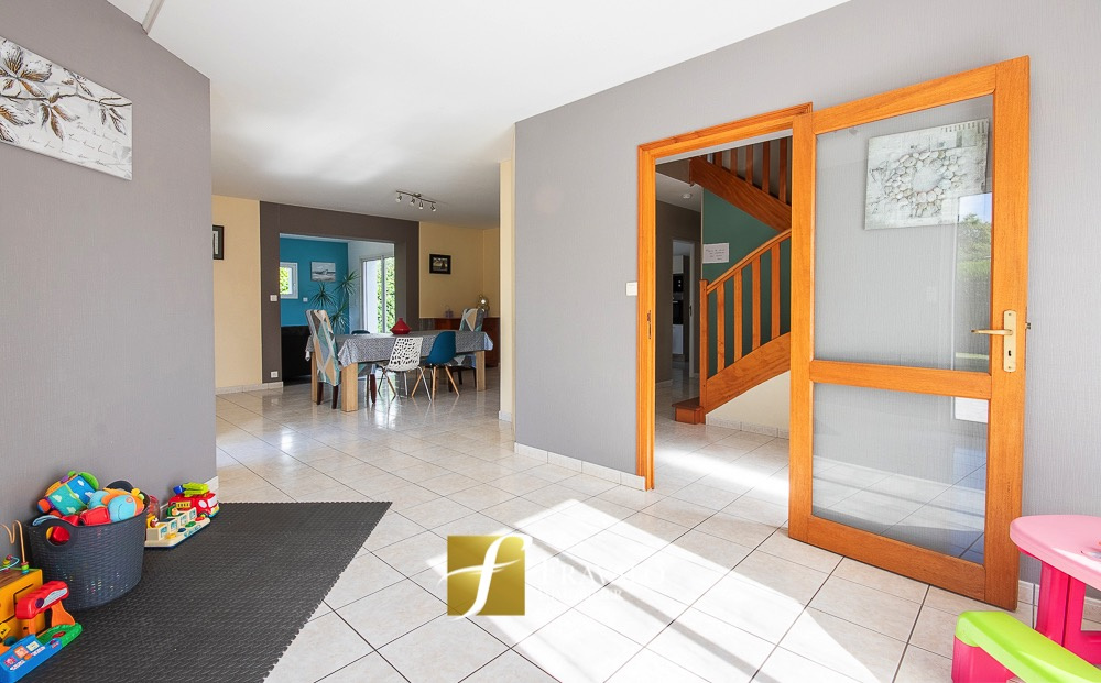 Située à proximité du bourg de Plougoumelen, cette maison des années 2000, parfaitement entretenue, vous séduira par ses volumes et sa fonctionnalité. Au rez-de-chaussée, elle offre une entrée, une vaste pièce de vie agrandie en 2015, une cuisine ouverte aménagée-équipée, une chambre avec salle d'eau attenante, un wc, un espace de rangement ainsi qu'un garage. A l'étage, vous trouverez quatre chambres, une salle de bains et un wc. Un local technique et un carport complètent cet ensemble édifié sur un terrain de 780 m2 entièrement clos. Estimation des coûts annuels d'énergie pour un usage standard du logement: entre 2320 EUR et 3190 EUR (abonnement compris). Les informations sur les risques auxquels ce bien est exposé sont disponibles sur le site Géorisques : georisques.gouv.fr