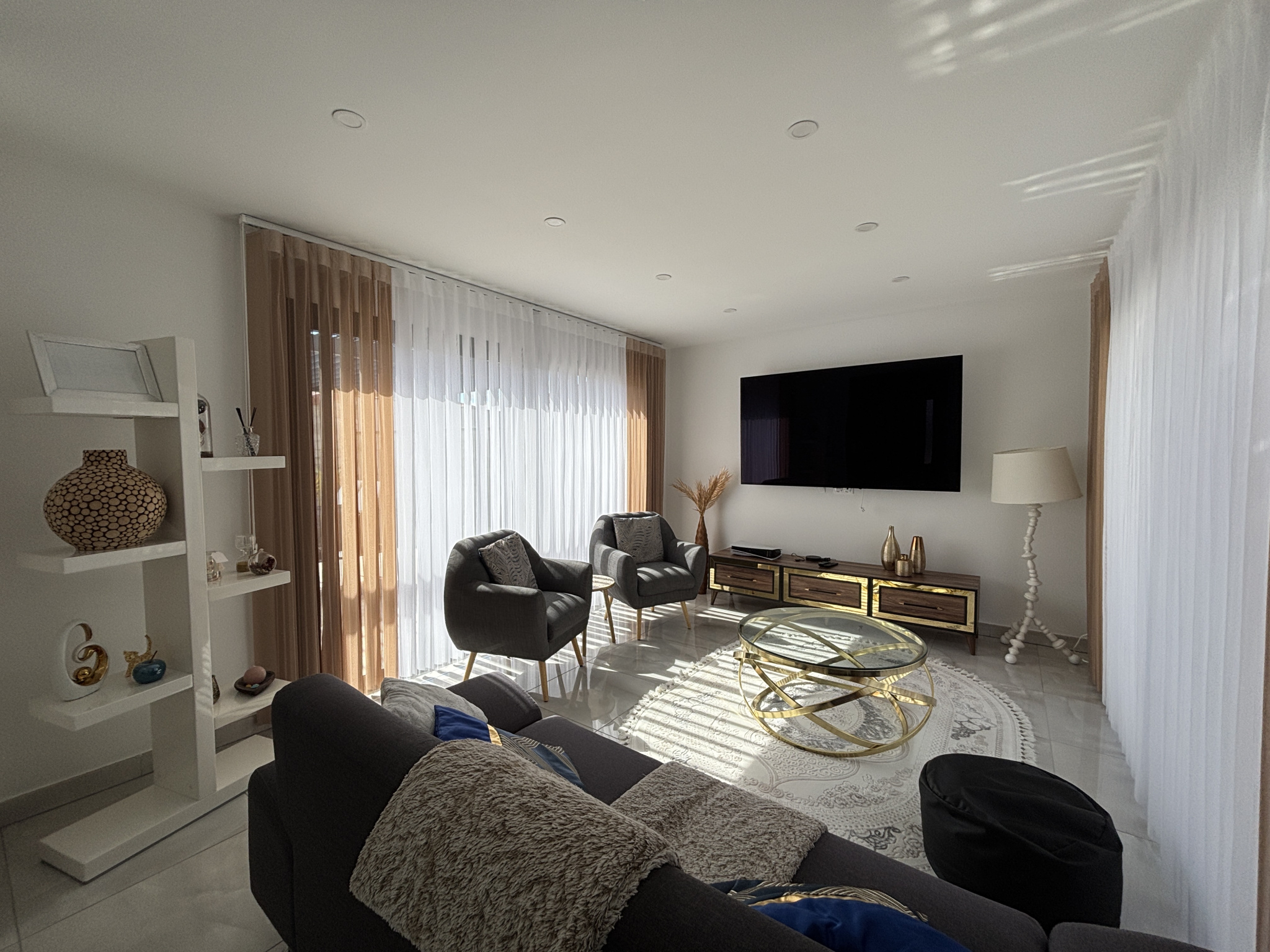 L'extérieur propose une piscine traditionnelle en pierres de Bali ( 8x4m), l'arrosage automatique, un pool house pour la machinerie de la piscine, une belle terrasse en travertin de 30 m2 couverte par une pergolas avec lames orientables l
