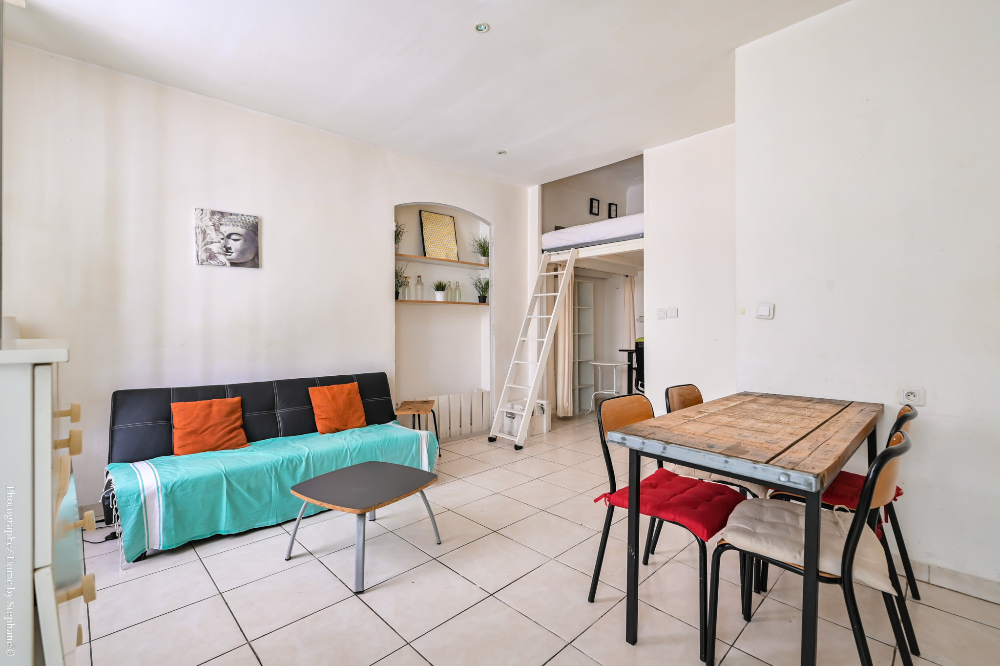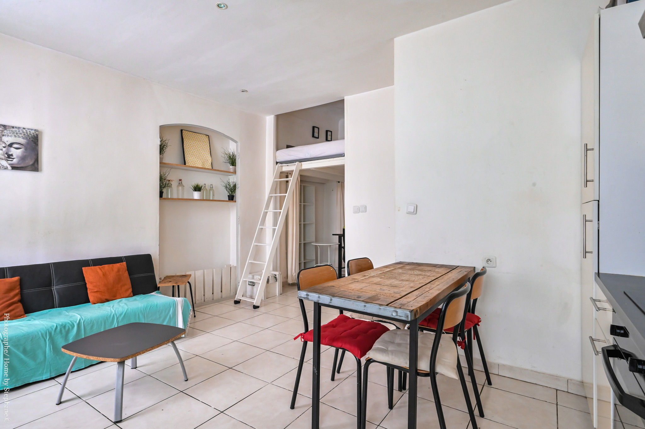 Avec une belle hauteur sous plafond, ce logement propose de beaux volumes et se compose d'un séjour avec cuisine ouverte équipée, d'une alcôve avec un espace bureau avec un coin nuit en mezzanine et d'une salle d'eau avec Water-Closet.