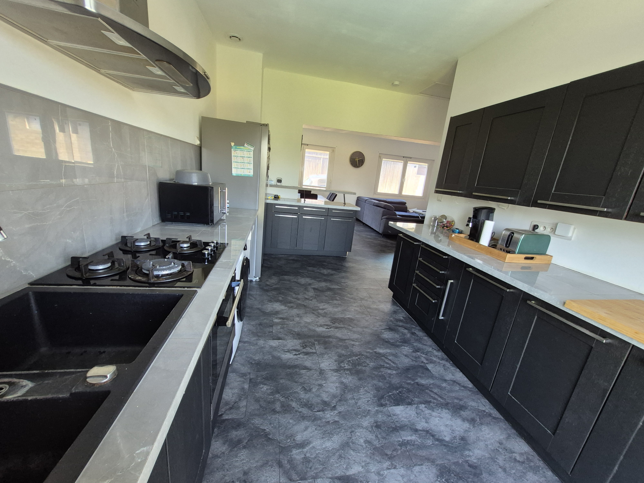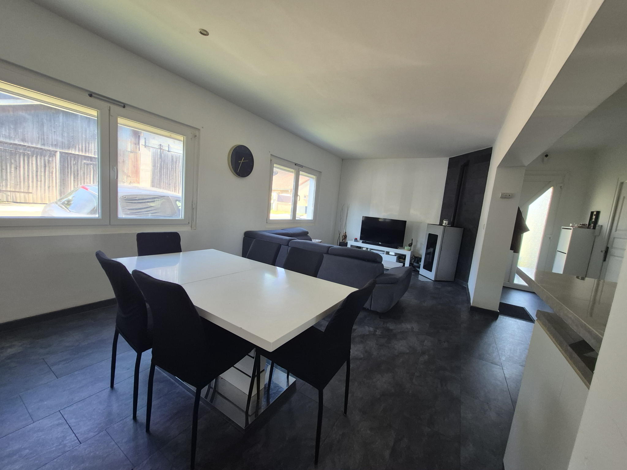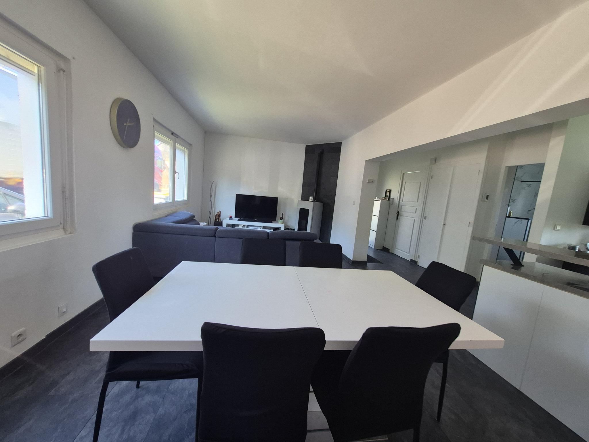 Un grand salon-séjour lumineux ouvert sur une cuisine rénovée