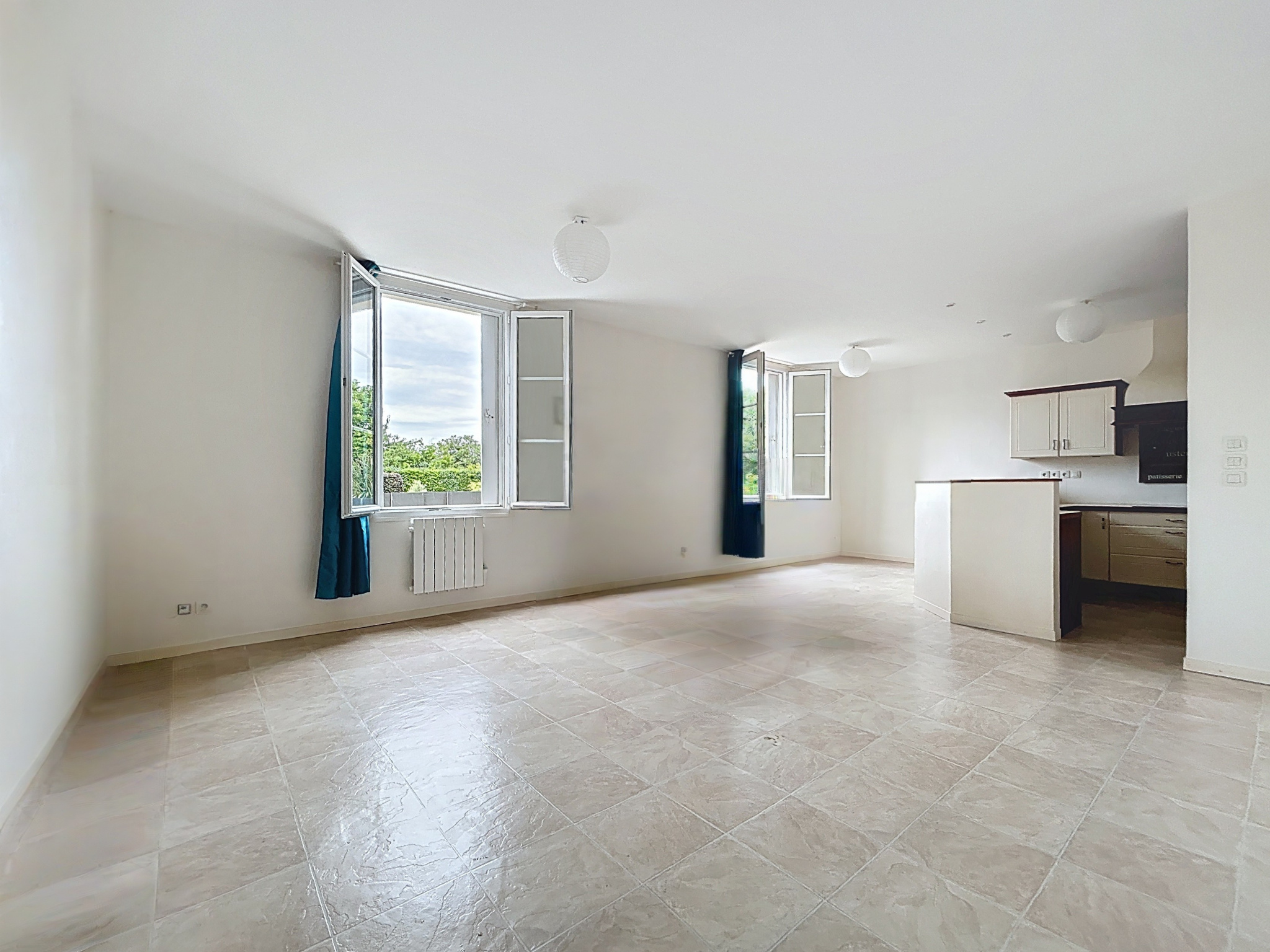Un salon lumineux, une cuisine entièrement équipée, une salle de bains et des WC séparés.