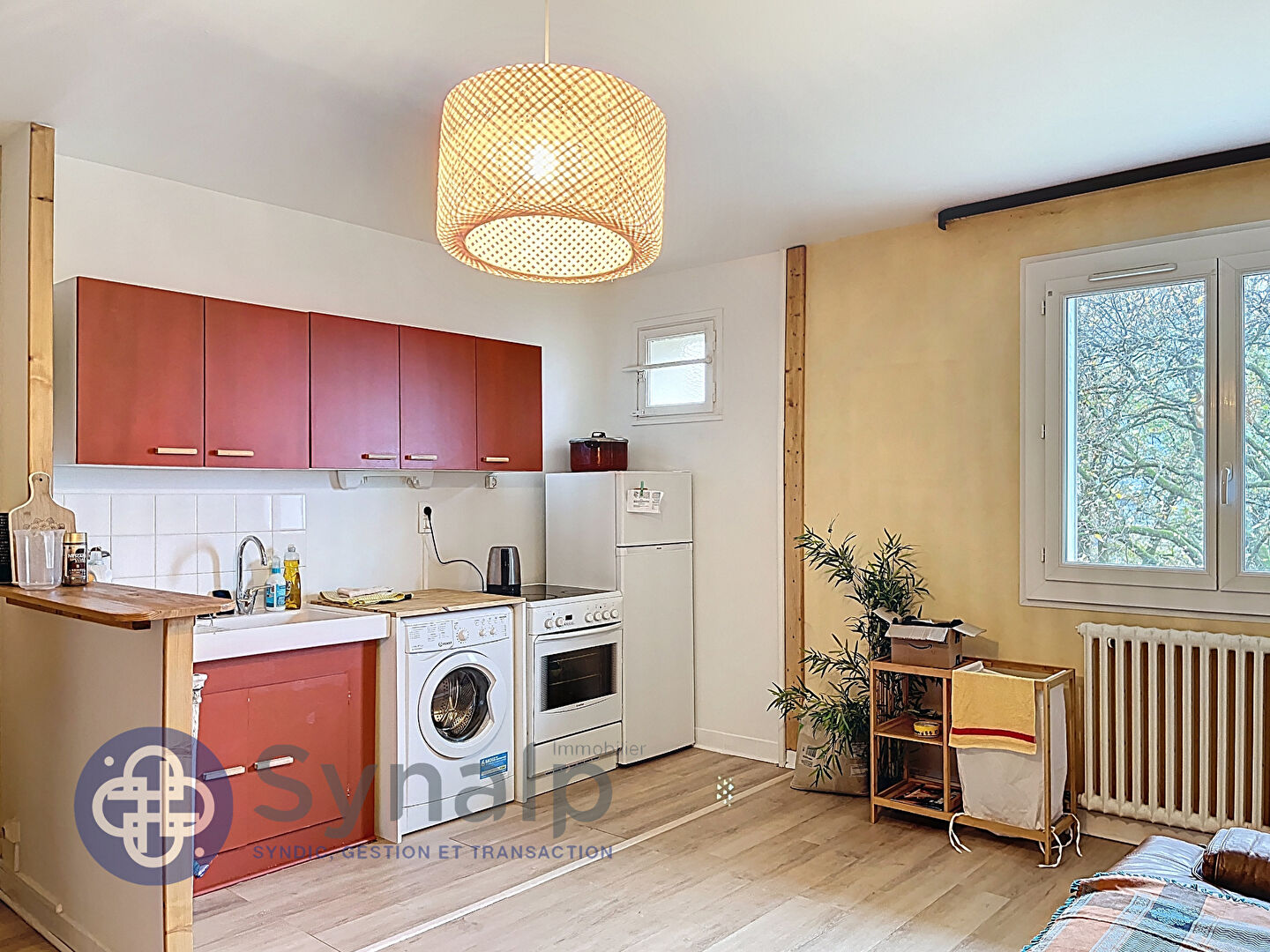 Vous trouverez une pièce de vie avec cuisine équipée, un dégagement, une chambre avec dressing et une salle d'eau avec WC. En annexe une cave d'environ 3m². Stationnement possible autour de l'immeuble, non privatif.