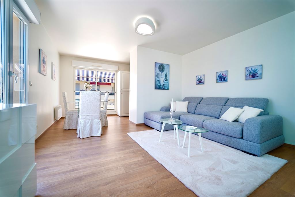 Les deux grandes portes-fenêtres du salon permettent un double accès à la terrasse filante de 33 m², inondant l'espace de lumière naturelle et offrant une magnifique vue latérale sur la mer.