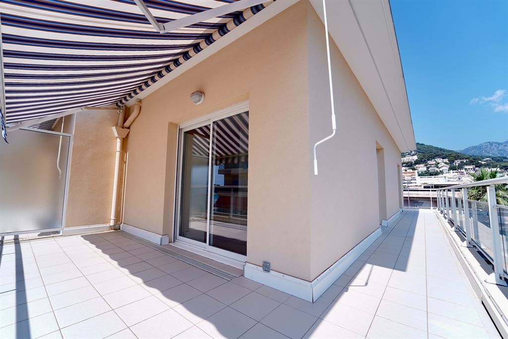 Ce magnifique espace de 72 m² qui constitue le cœur vibrant de l'appartement, offre une vue panoramique à 360°, surplombant la mer et les collines environnantes.