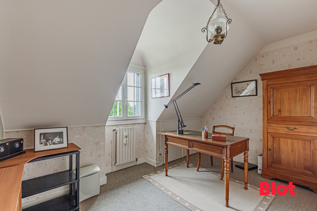 À l'étage, trois chambres accueillantes et un espace bureau et une salle de bains ainsi qu'un WC permettent de concilier confort familial et télétravail.