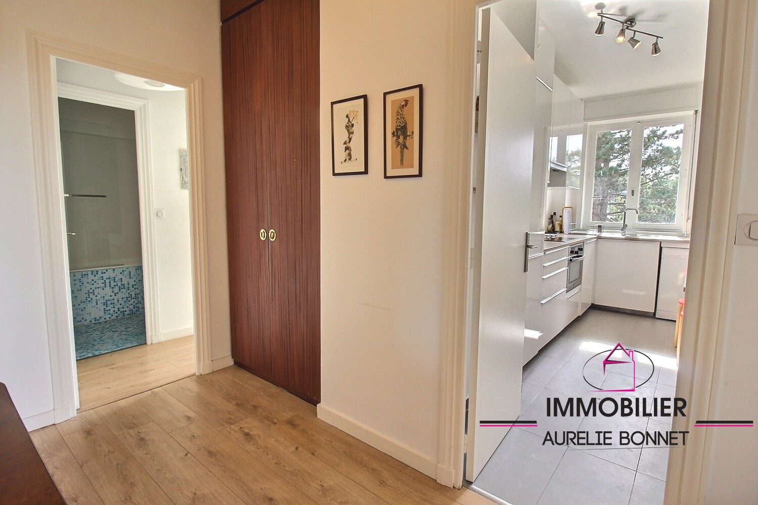 L'entrée avec placard dessert un séjour-salon lumineux (vue mer) avec deux grands balcons exposés sud-ouest et nord-ouest, une cuisine indépendante aménagée et équipée.
