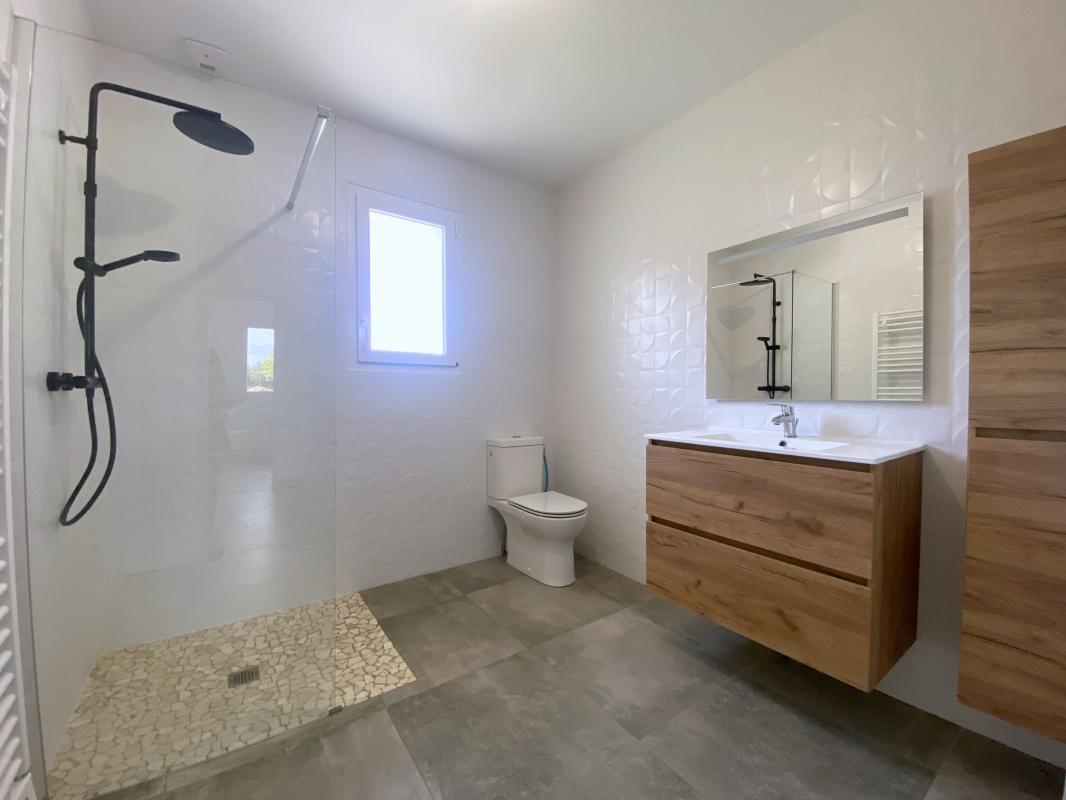 Agréable pièce à vivre traversante de 35 m2, baies vitrées ouvrant sur une terrasse et jardin , cuisine aménagée, cellier, 3 chambres, WC séparés, une salle d'eau moderne avec WC et faïence murale.