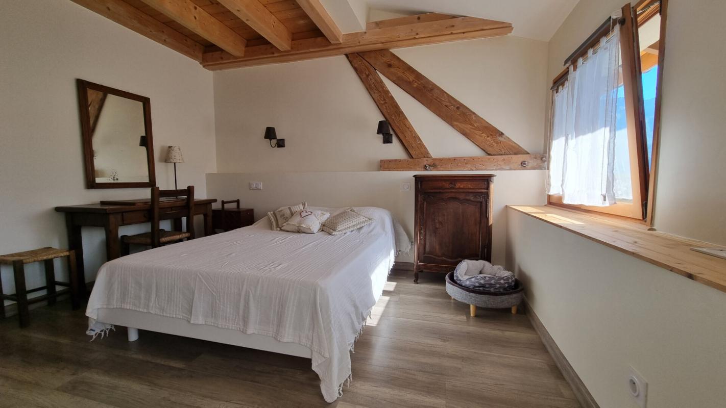 Premier niveau : entrée, deux grandes chambres, salle de bains, dressing, WC, ainsi qu'une splendide pièce de vie cathédrale baignée de lumière, avec cuisine ouverte aménagée et équipée, poêle à bois, balcon et grande terrasse. Vous profiterez d'une vue panoramique sur les montagnes et le lac, sans doute l'une des plus belles du secteur.