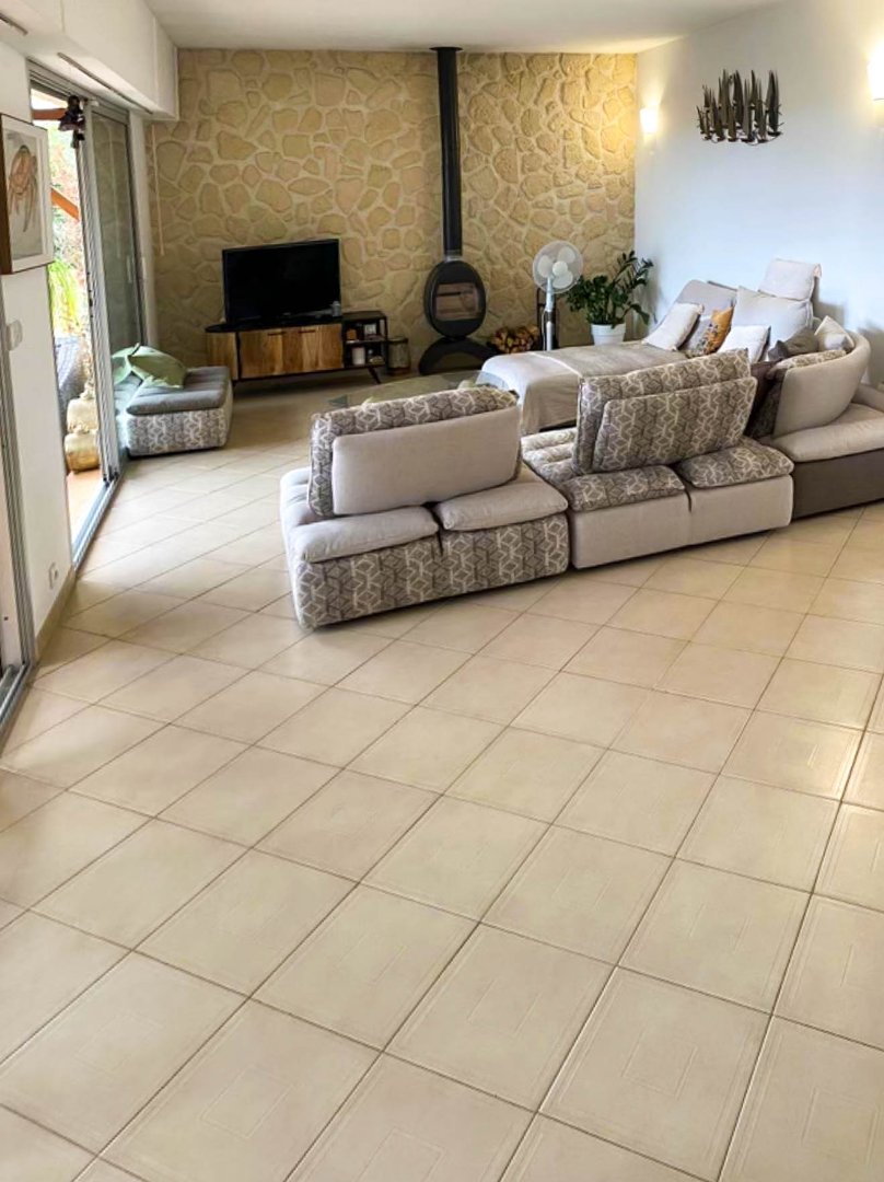 Rez-de-chaussée : Pièce de vie d'environ 40 m2 donnant sur une grande terrasse, cuisine semi-ouverte, buanderie, 3 chambres, salle de bains, toilettes indépendantes