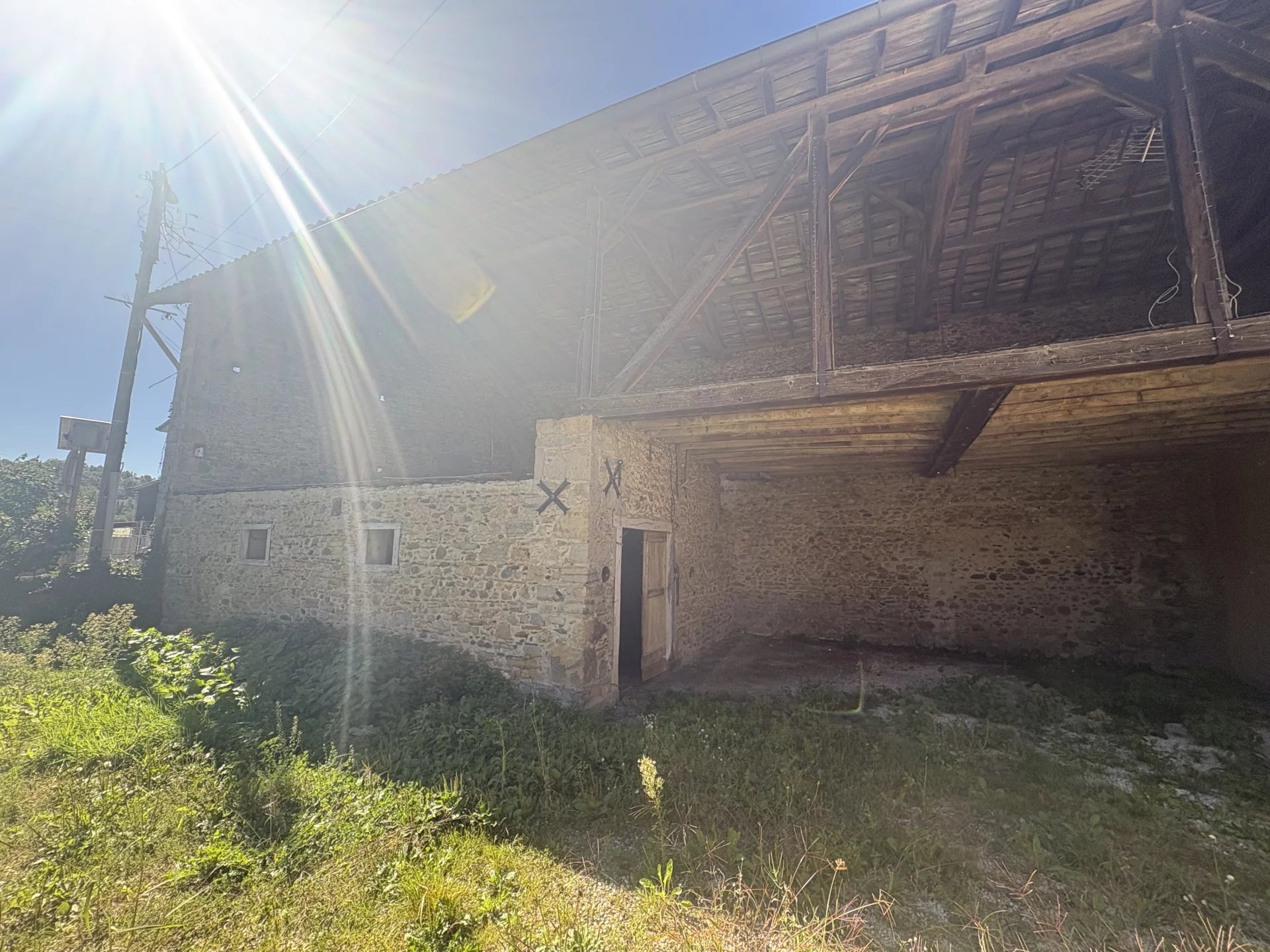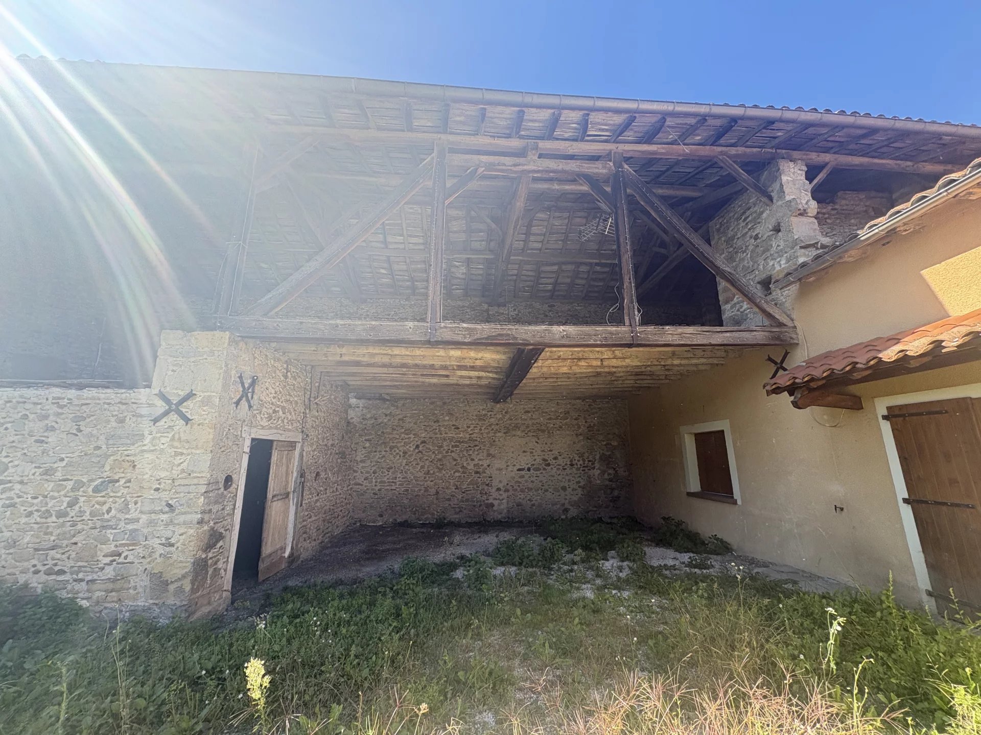 Maison en pierres anciennes présentant un salon, une cuisine séparée, un séjour, deux chambres et une salle d'eau avec douche italienne, et des wc indépendants.