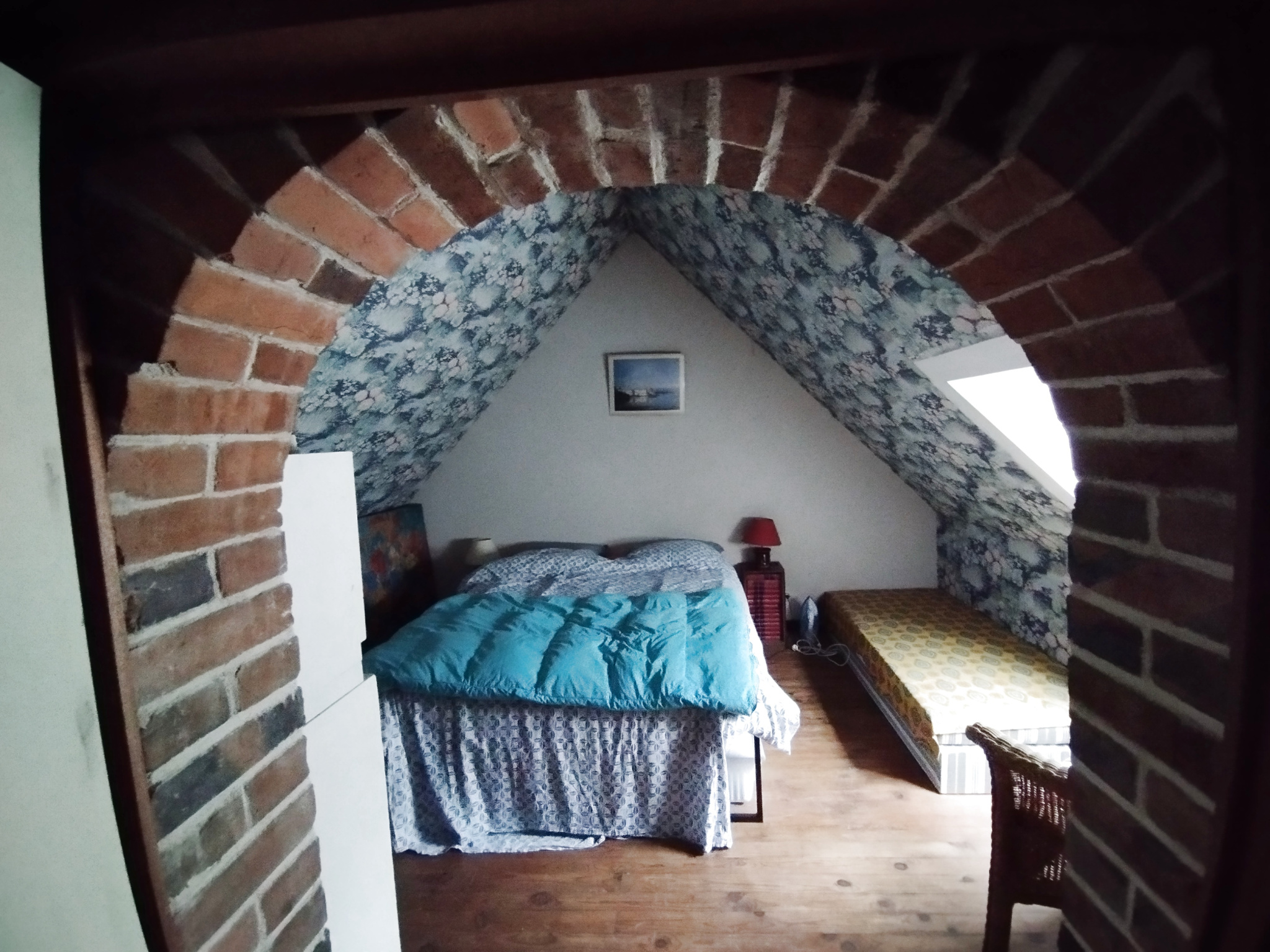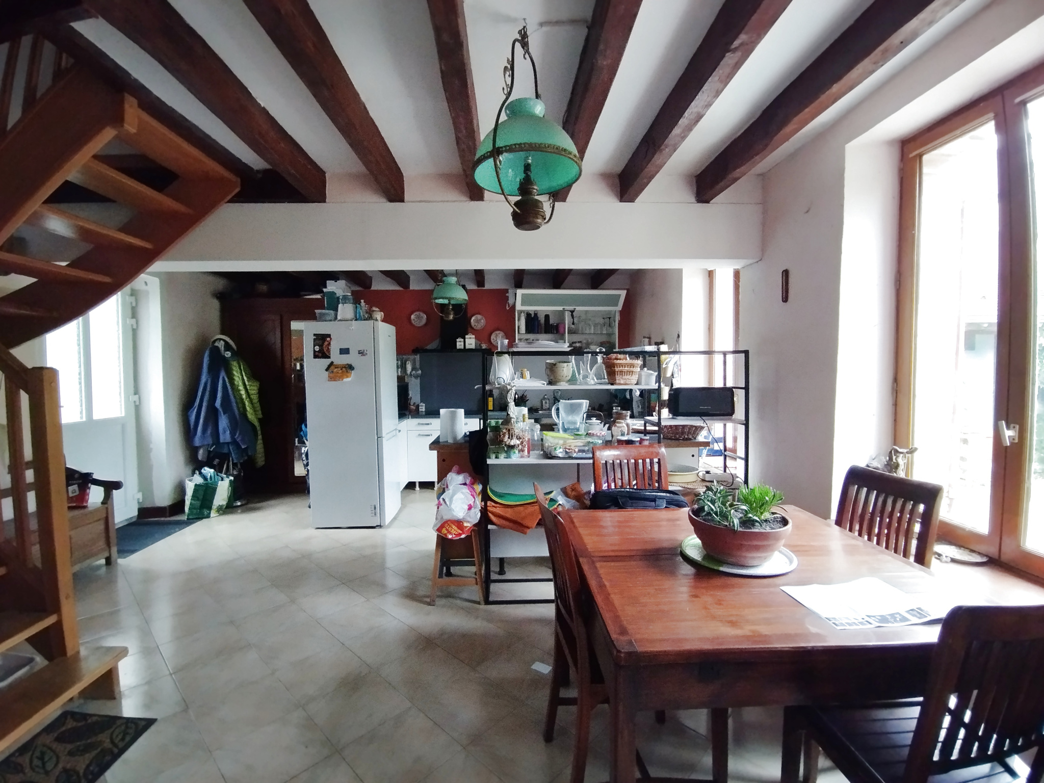Salon salle à manger avec cheminée et avec coin cuisine. A l'étage: une chambre avec placards, salle d'eau-wc, pièce, une autre chambre