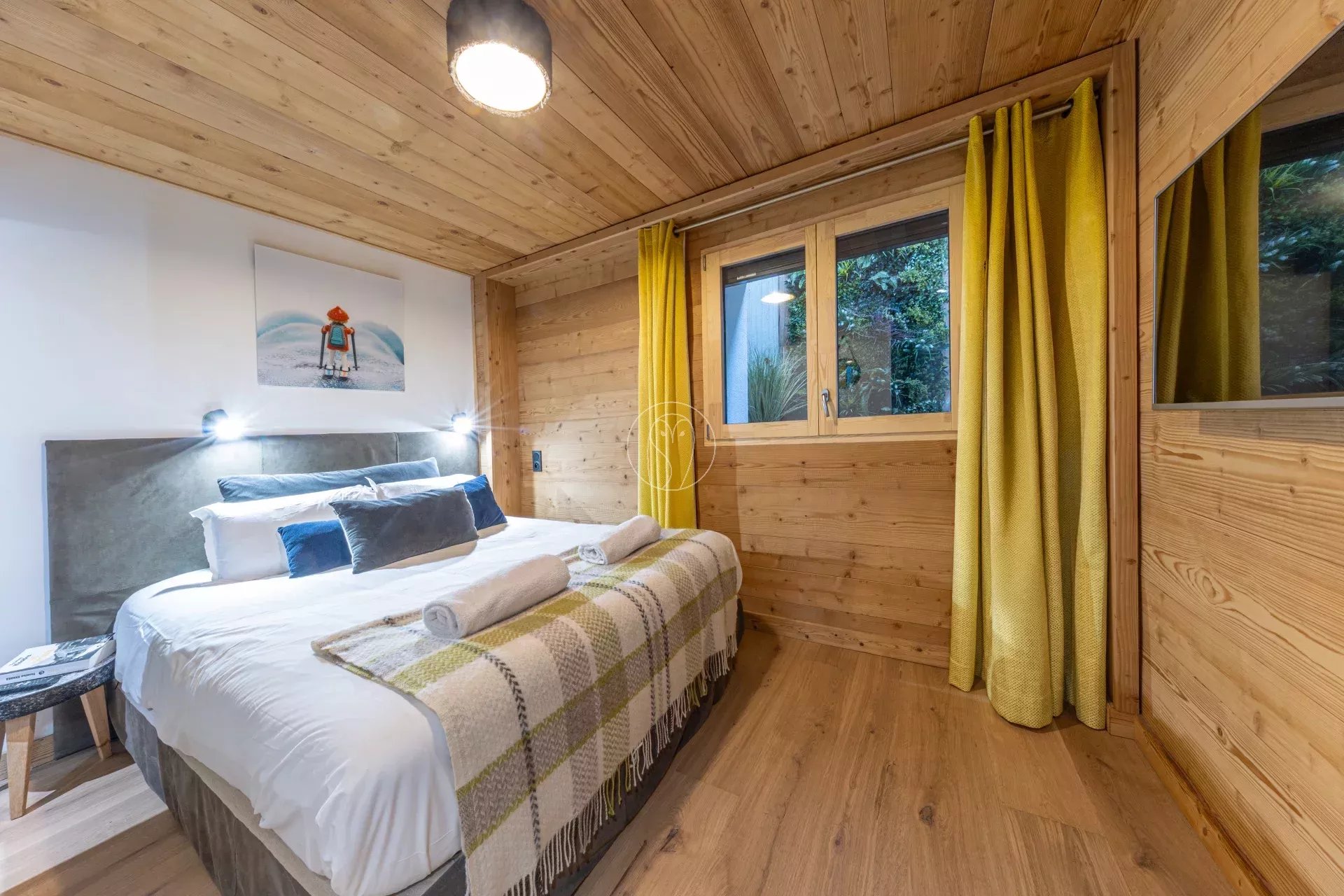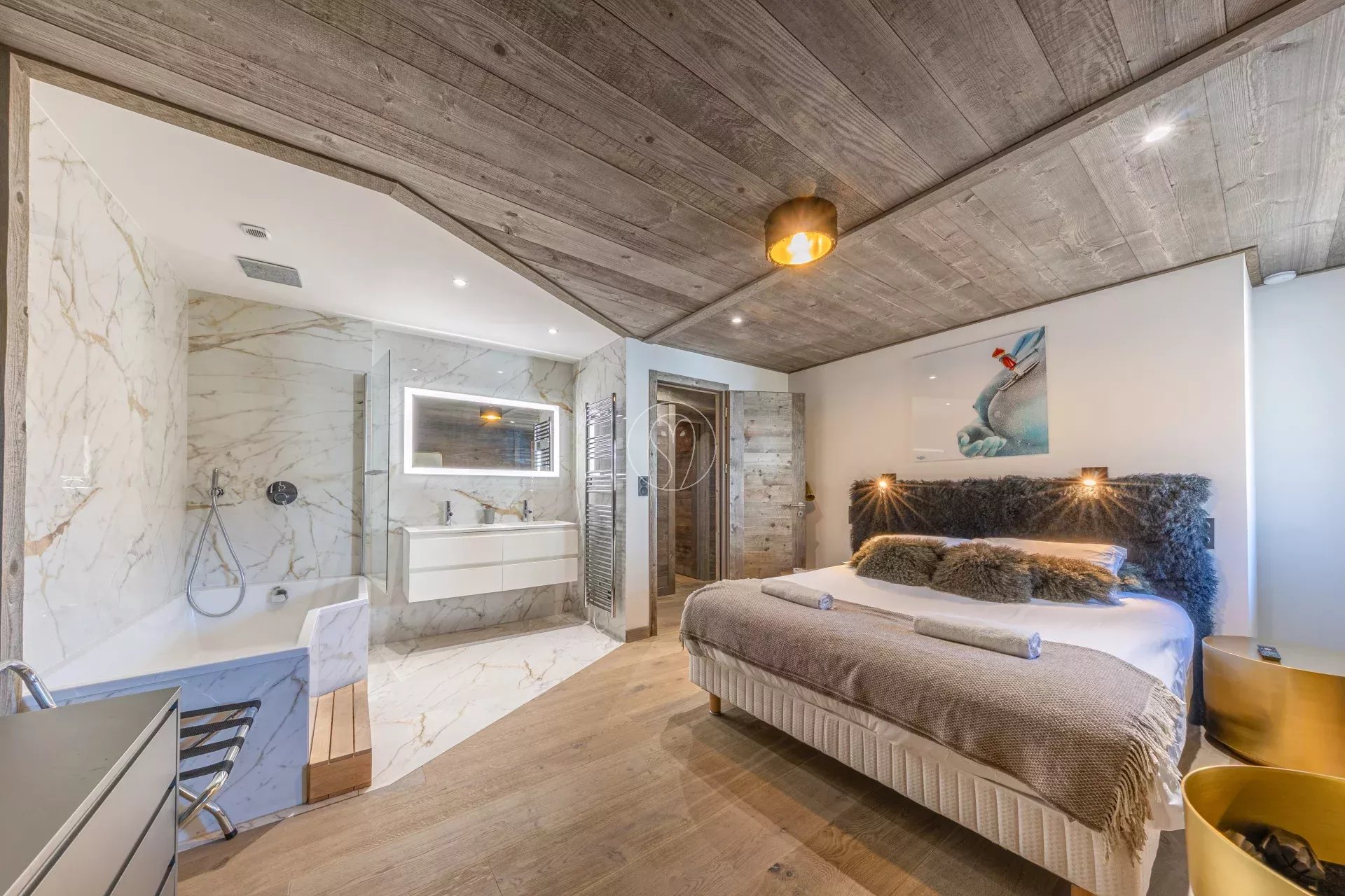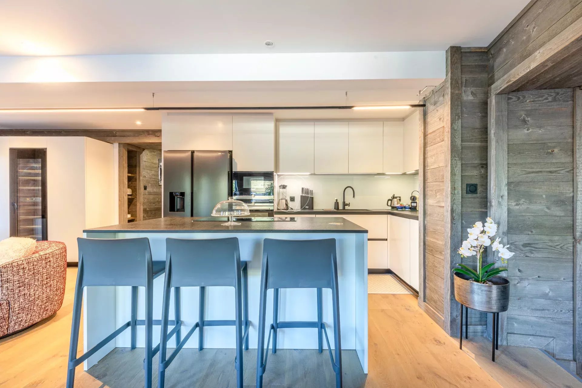 Il dispose d'une entrée avec rangements et ski room, une grande pièce de vie avec cuisine ouverte, cheminée à gaz, salle à manger et accès à la très grande terrasse. Celle-ci dispose d'un sauna et peut accueillir un jacuzzi.