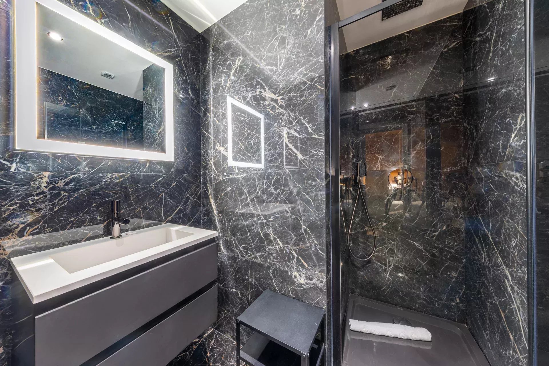 Côté nuit, nous retrouvons une chambre principale avec salle de bains ouverte, une chambre double avec salle de douches, une chambre double et une chambre d'enfants qui se partagent une salle de douches. Deux WC séparés.