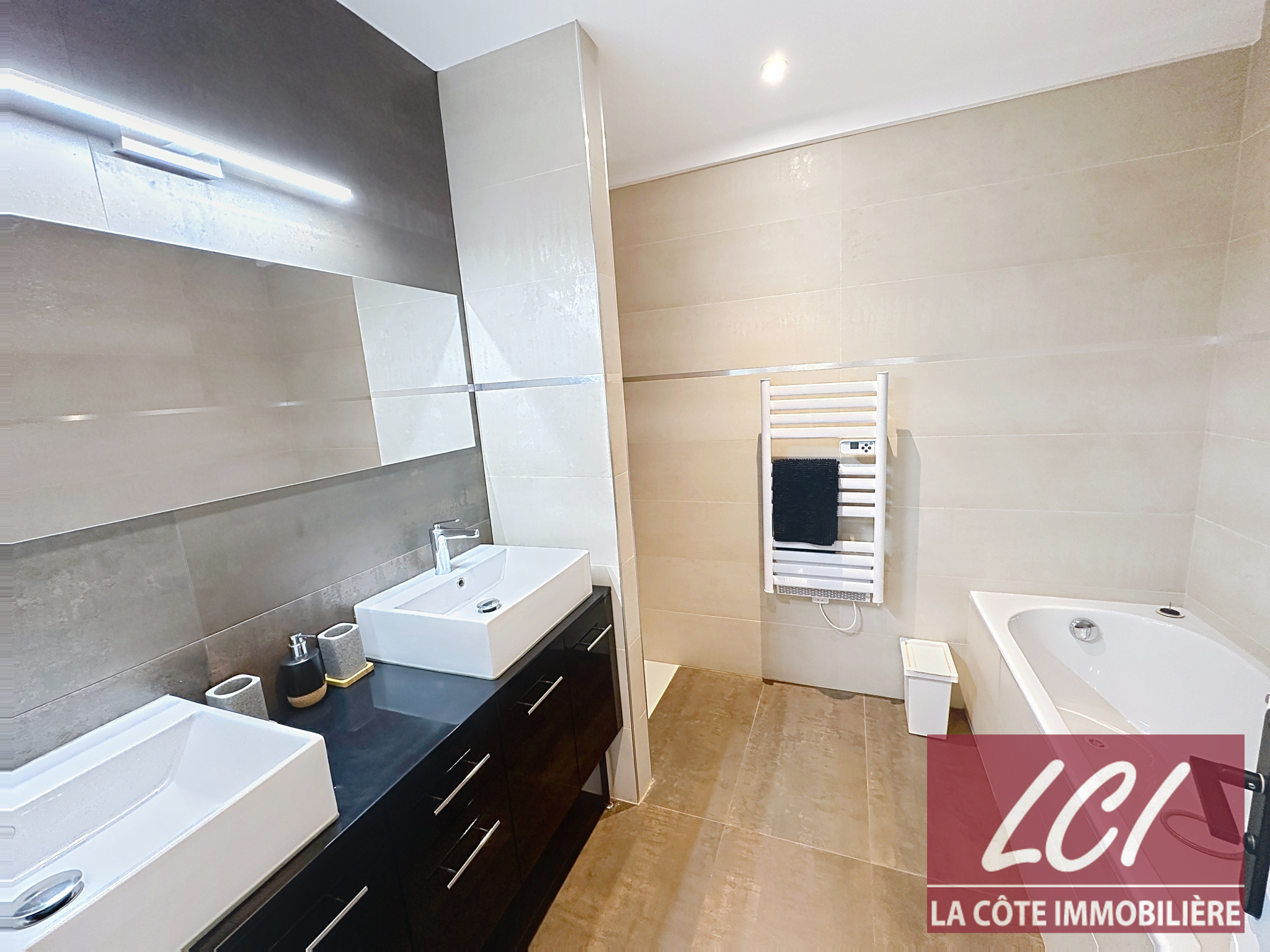 Entrée avec placard, séjour climatisé avec belle cuisine aménagée et baie à galandage ouvrant sur la terrasse, belle salle de bains avec baignoire et douche, wc indépendant, 3 chambres climatisées avec placard.