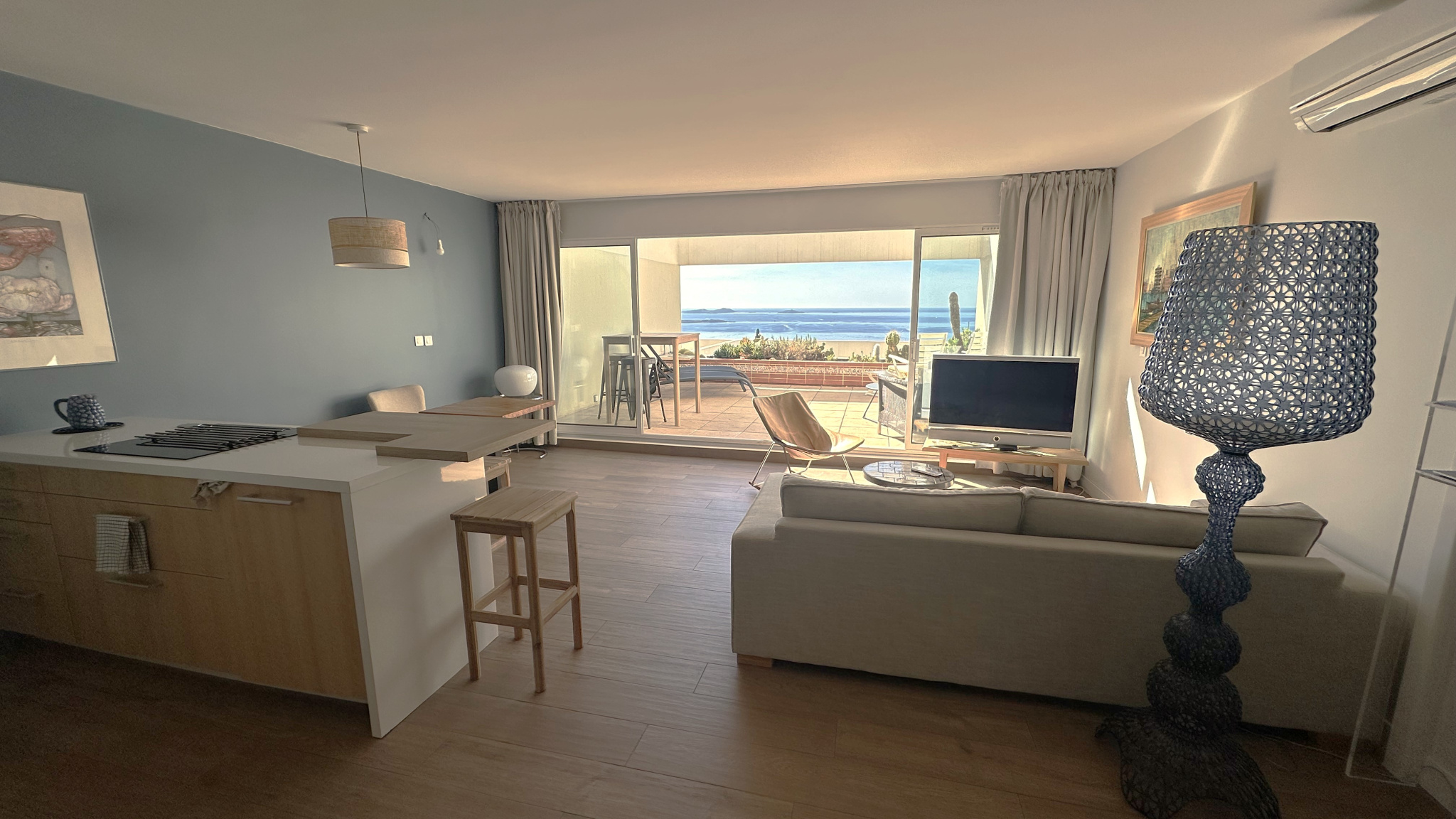 BANDOL - EXCLUSIVITE résidence Les Katikias, dans le cadre idyllique d'une résidence de standing avec piscine, appartement T2 de 44M2 comprenant : une entrée de plain pied par un escalier avec placards, un séjour avec cuisine ouverte entièrement équipée l'ensemble donnant sur une magnifique terrasse offrant une vue mer panoramique, une chambre avec placards, une salle d'eau et un WC indépendant. L'appartement est entièrement climatisé, rénové avec soin et ne nécessite aucun travaux.