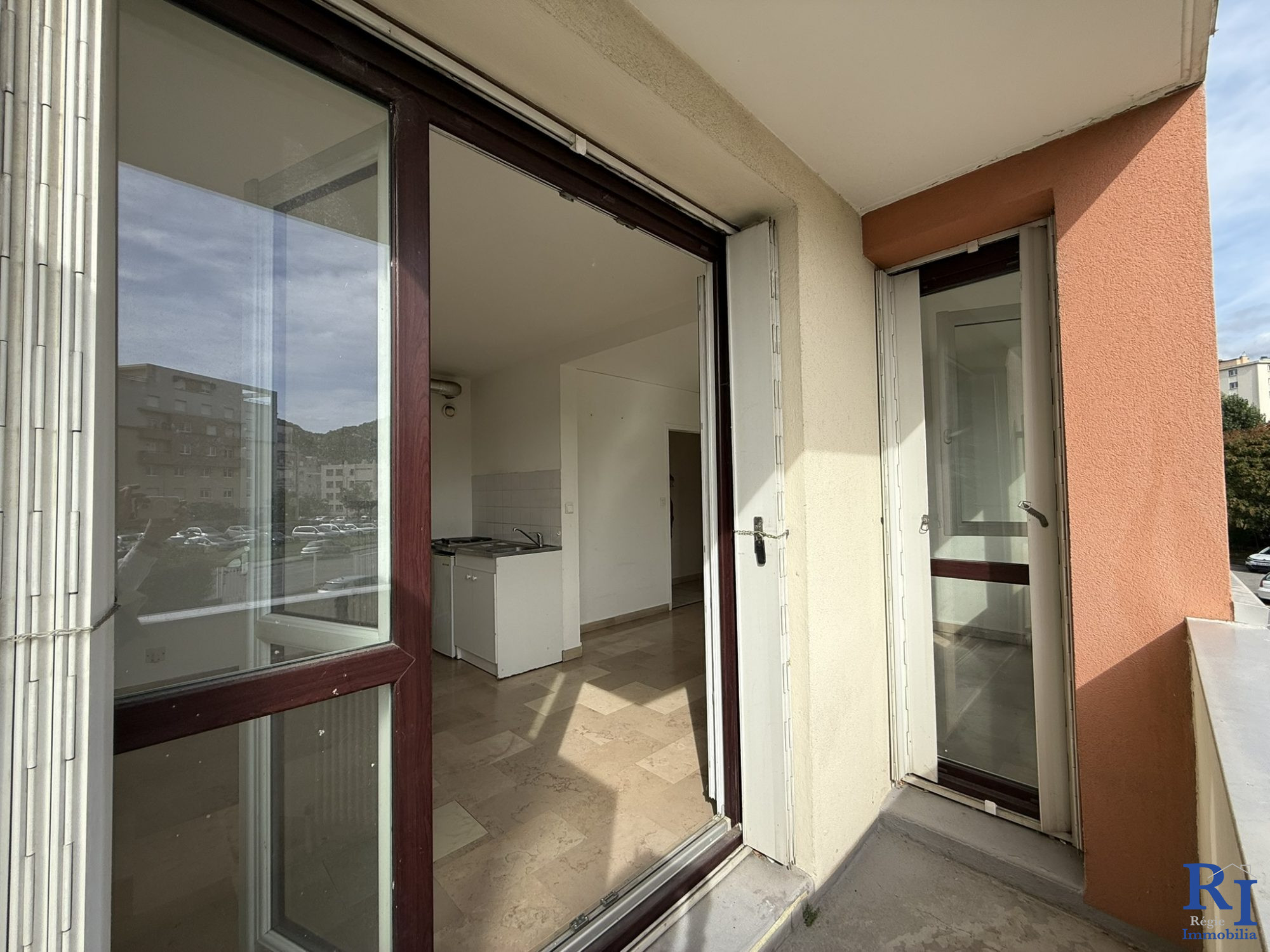 Une pièce à vivre de 20 m², lumineuse grâce à ses grandes ouvertures en PVC à double vitrage, offre une vue dégagée et permet l'accès au balcon. Le coin cuisine est pratique et fonctionnel.