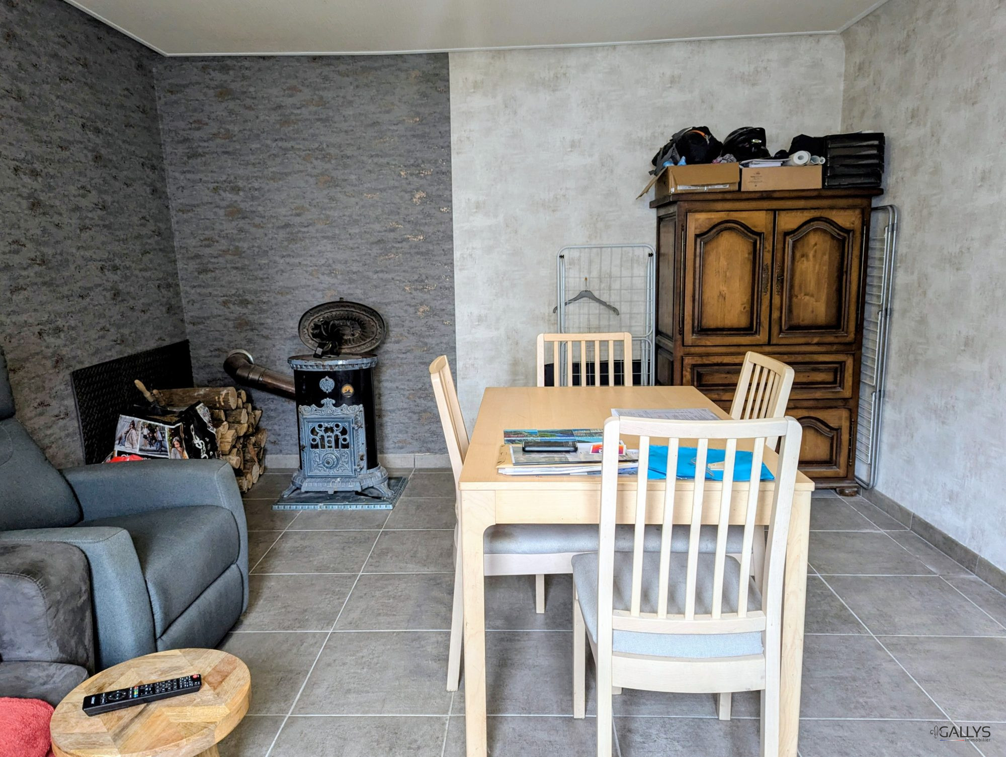 - Un salon d'environ 17,90 m² avec un poêle à bois de la marque GODIN.