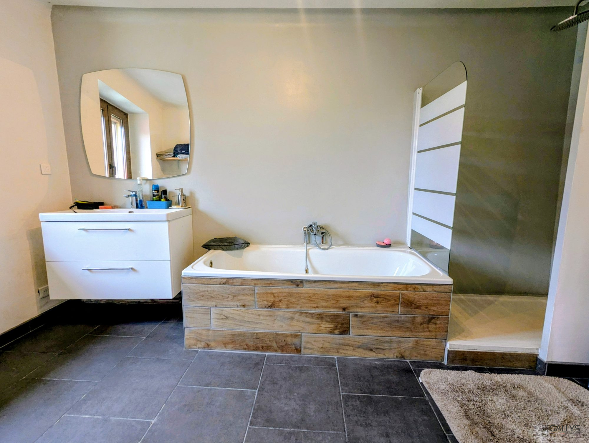 - Une salle de bains de 12,35m². Entièrement rénovée et équipée d'une douche à l' italienne, d'une baignoire, d'une vasque avec miroir.