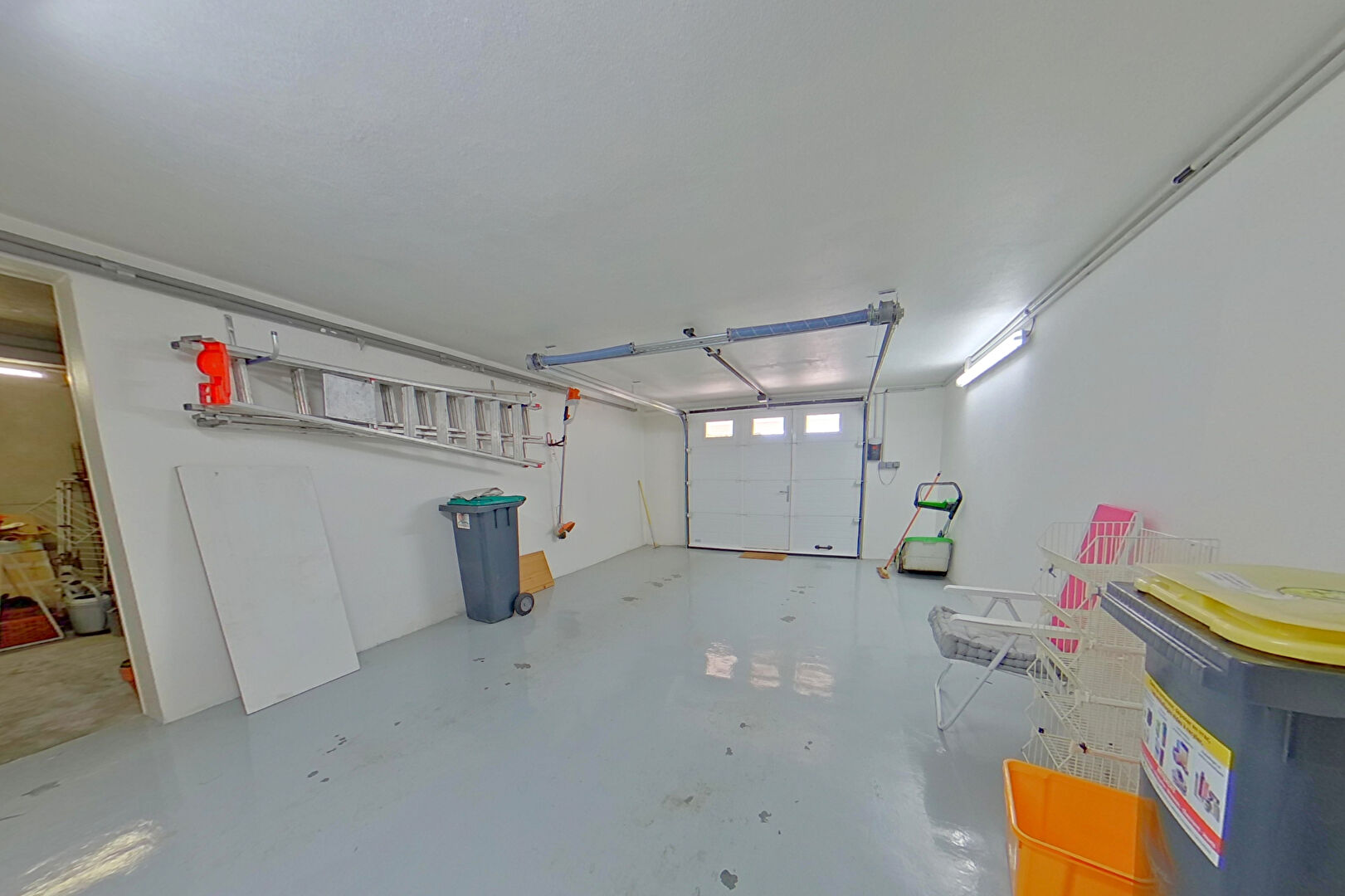 En rez-de-jardin, se trouvent : une cuisine d'appoint, un bureau, une chambre avec salle d'eau attenante, wc, une cave, la chaufferie et l'espace garage.