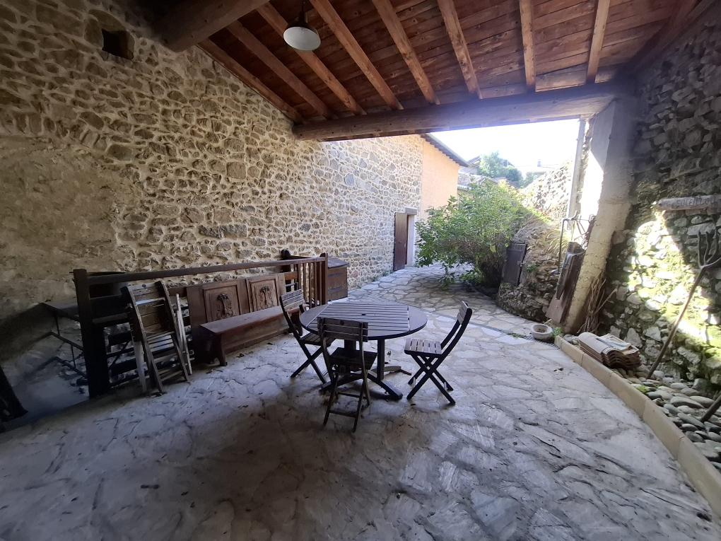 Agréable cour attenante avec terrasses et dépendance.