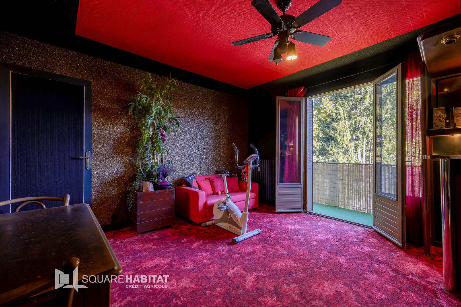 Une pièce de vie lumineuse donnant accès à un grand balcon de 15 m² avec vue dégagée sur la verdure.