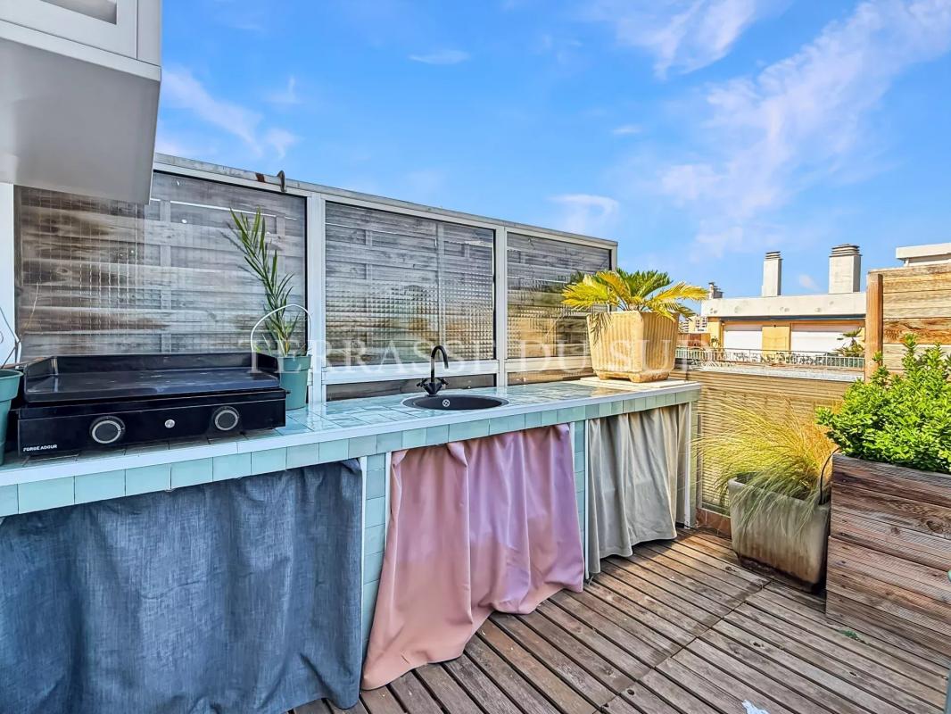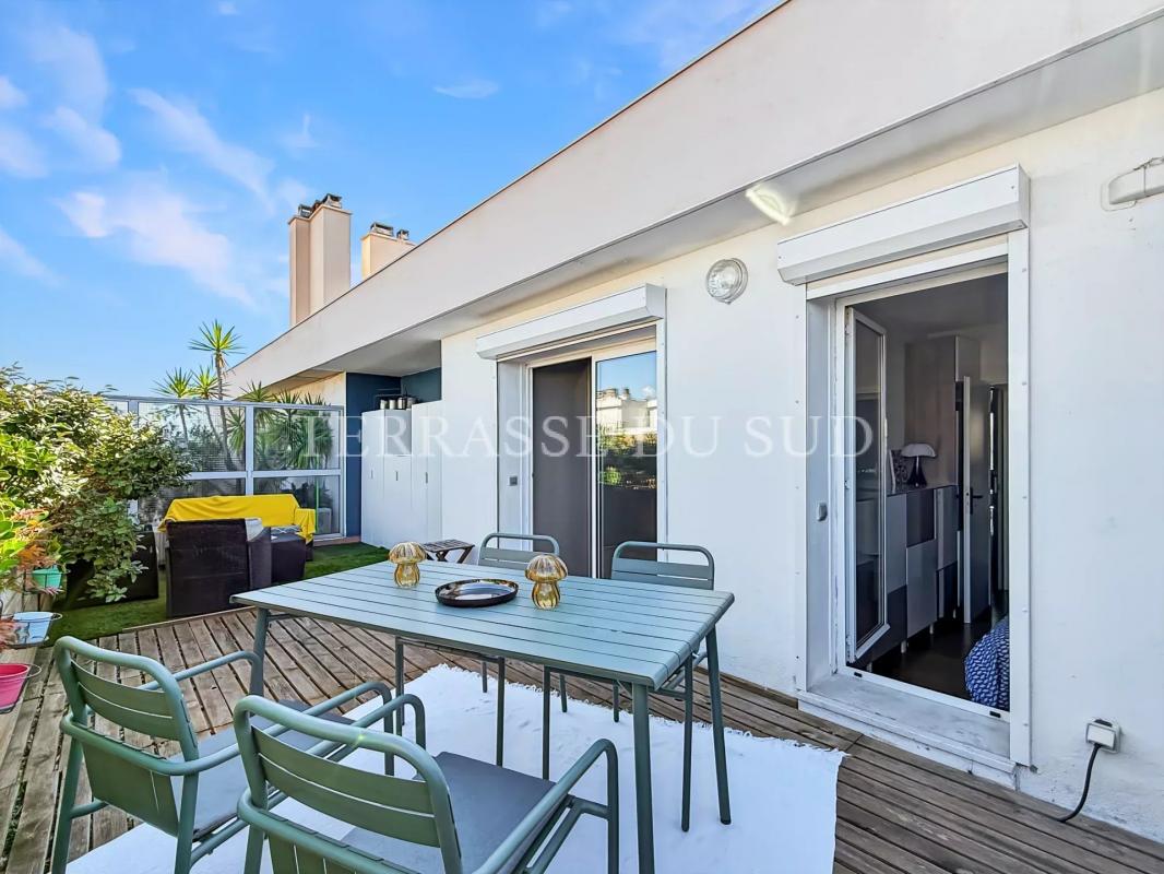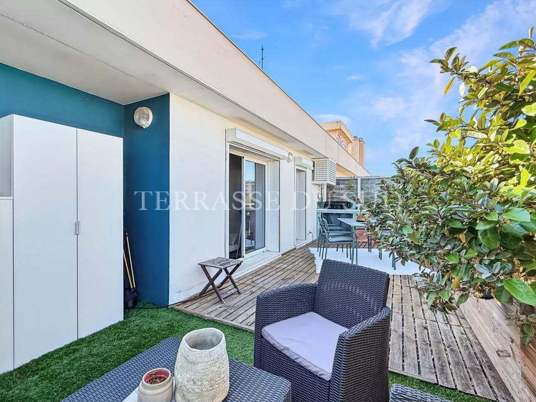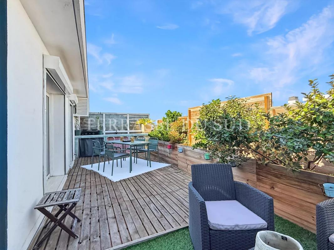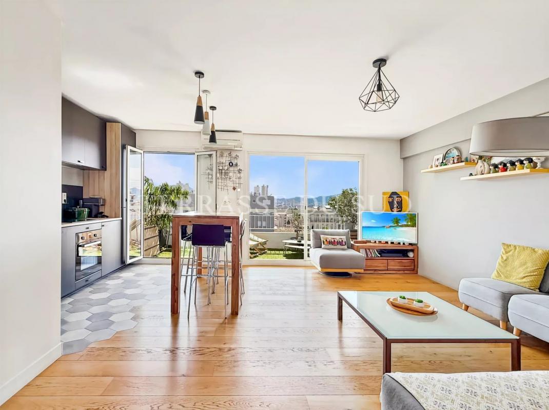 TERRASSES PLEIN CIEL DE 42M2 POUR CE SUBLIME T3, EN DERNIER ETAGE. En parfait état et inondé de lumière, cet appartement a fait l'objet d'une rénovation complète dirigée par architecte. En dernier étage avec ascenseur d'une copropriété semi-récente bien tenue, il est traversant Nord-Sud, et entièrement parqueté. Il offre une entrée qui distribue: au SUD une pièce de vie avec cuisine ouverte ouvrant sur une terrasse au calme, en surplomb des jardins de la résidence. La vue, sans vis à vis, dévoile un panorama allant du massif de l'Etoile à celui des Calanques; protégés des vents dominants, vous pourrez y prendre vos repas tout au long de l'année. Au Nord, deux chambres avec rangements ouvrent sur une seconde terrasse avec cuisine d'été, à l'abri des regards; de ce côté ci, ce sont les splendides couchers de soleil et la Bonne Mère qui agrémenteront vos soirées et journées estivales. Une jolie salle d'eau et des toilettes indépendantes complètent cet ensemble superbe, aux prestations de belle facture. Finitions très soignées pour un appartement prêt à habiter. Prestations: doubles vitrages, volets roulants électriques, porte blindée, chauffage et eau chaude inclus dans les charges de copropriété, climatisation, cave. L'isolation et l'étanchéité de la toiture ont été votées et payées en 2025. Possibilité d'acquérir en sus une place de stationnement en sous sol de l'immeuble (hauteur de véhicule jusqu'à 2 mètres). UNE PÉPITE ABSOLUE, À QUELQUES MINUTES À PIEDS DU MÉTRO BAILLE (DIRECT CASTELLANE, VIEUX PORT, SAINT CHARLES), A PROXIMITÉ IMMÉDIATE DES HOPITAUX CONCEPTION ET TIMONE, DES ACCÈS AUTOROUTES ET DE TOUS LES COMMERCES.