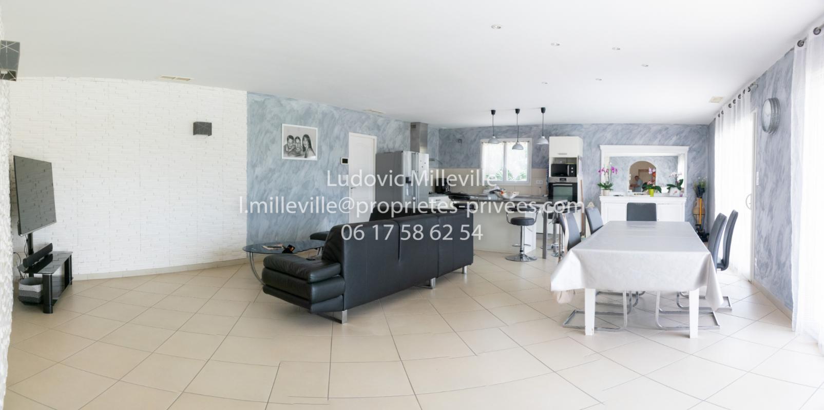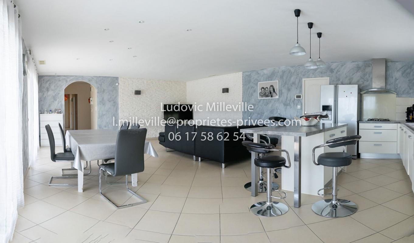 la villa vous propose un hall d'entrée, un wc indépendant , un belle pièce a vivre avec cuisine équipée aménagée de 54 m² , climatisée et lumineuse avec accès par baies vitrées sur la terrasse et la piscine , à l'arrière de la cuisine vous accèderez au garage et à l'espace buanderie..