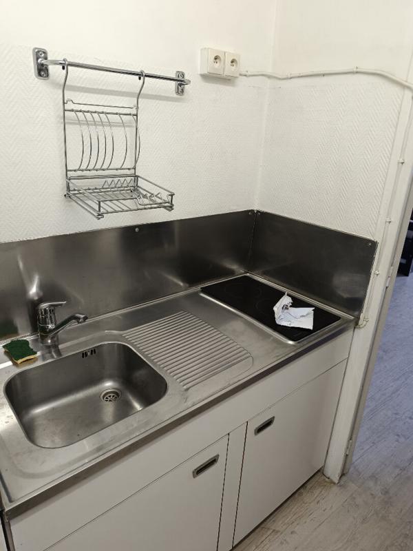 La cuisine aménagée comprends des plaques de cuisson, réfrigérateur et placard de rangement.