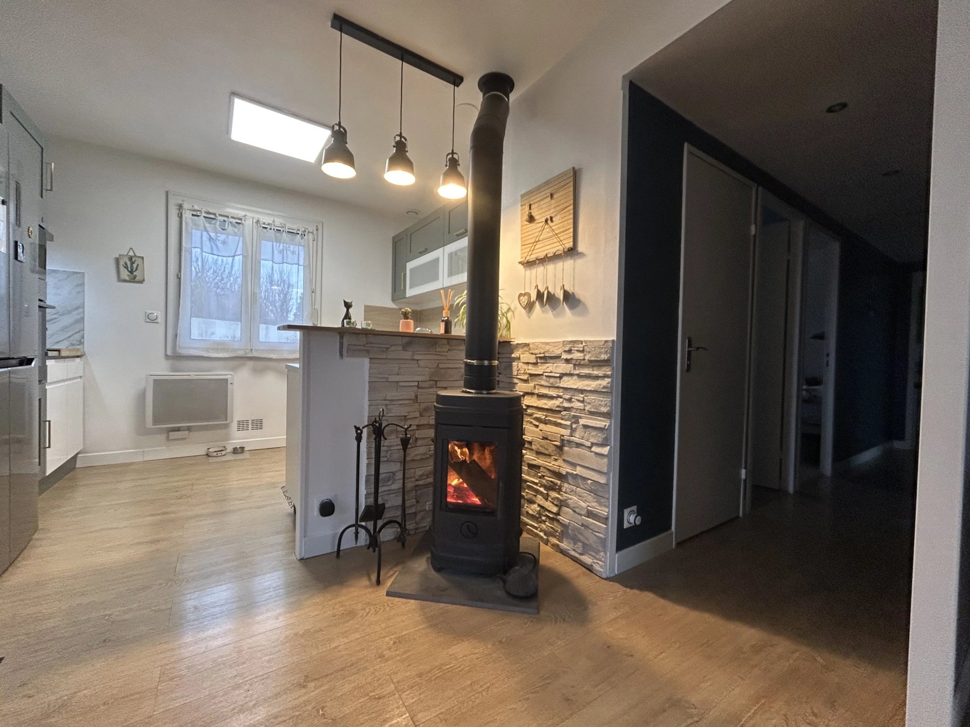 Édifiée sur un terrain clos de 493 m², elle se compose d'une entrée,une cuisine aménagée et équipée, ouverte sur un séjour lumineux avec poêle,un dégagement desservant 4 chambres avec rangements, une salle de bains,un WC indépendant,