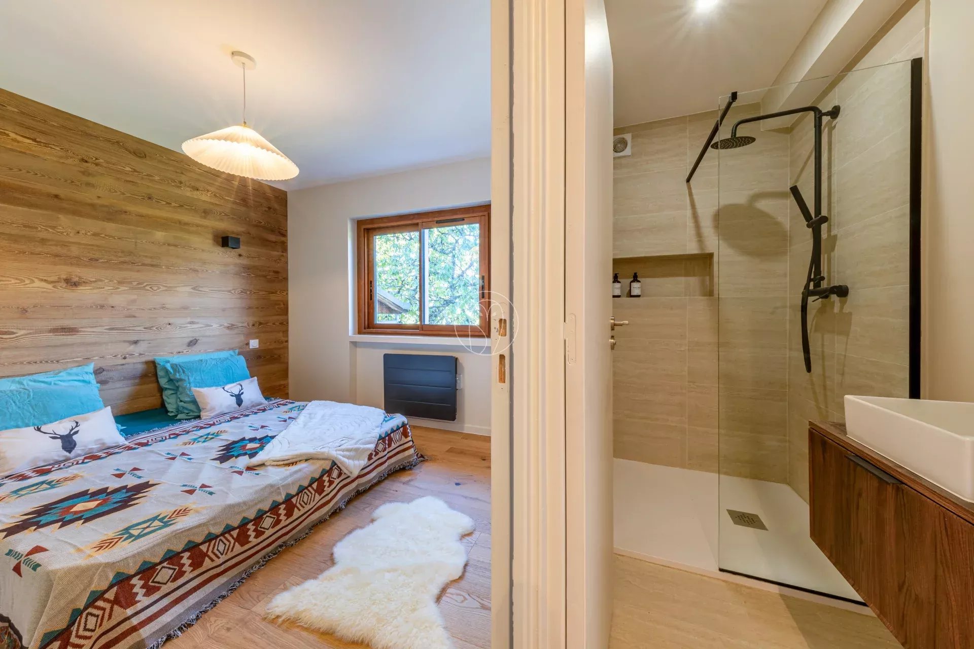 Situé à Combloux, cet appartement en rez-de-jardin, au sein d’une petite copropriété de quatre lots au style chalet entièrement rénovée, offre une surface de 108 m².