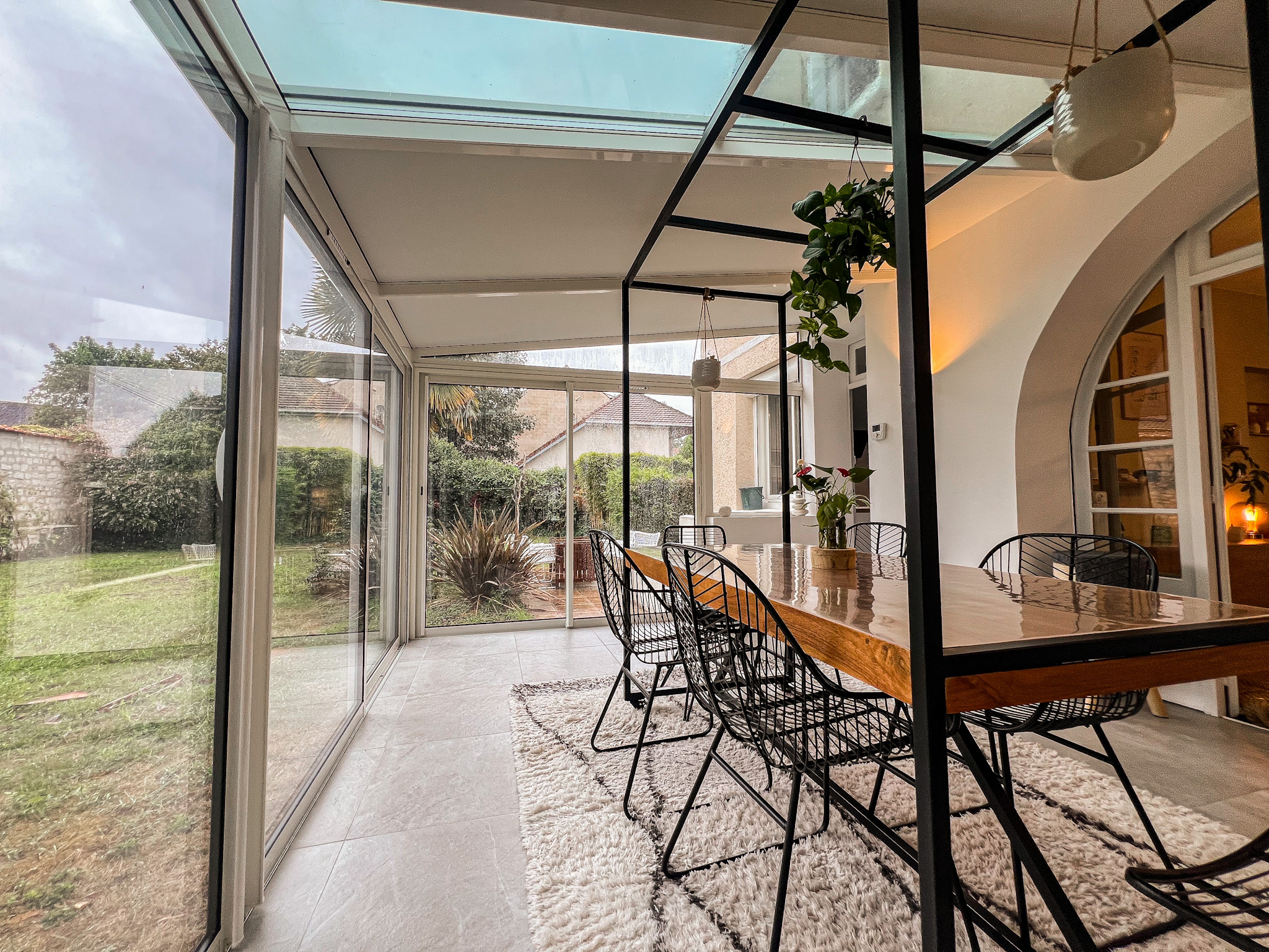 Dès l'entrée, le charme opère : un salon convivial habillé de pierres apparentes et de parquet ancien offre un cadre plein de caractère. Le poêle à bois apporte une douce chaleur l'hiver et crée une ambiance intime pour des soirées au coin du feu. Traversant, l'espace se prolonge vers une véranda baignée de lumière, entièrement refaite en 2023 et pensée comme une salle à manger tournée vers le jardin. Cette pièce donne la sensation unique de vivre dedans comme dehors, dans une bulle apaisante. La cuisine séparée, au style épuré, bénéficie elle aussi d'une belle ouverture sur la verdure. Au rez-de-chaussée vous y trouverez également un WC indépendant ainsi qu'un accès au sous-sol mènent, à mi-étage, vers un espace pratique comprenant la buanderie et le garage (chaudière installée en 2021), gage de confort et de tranquillité.