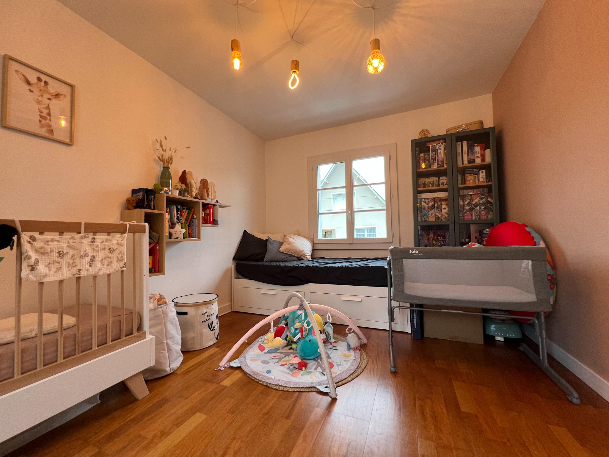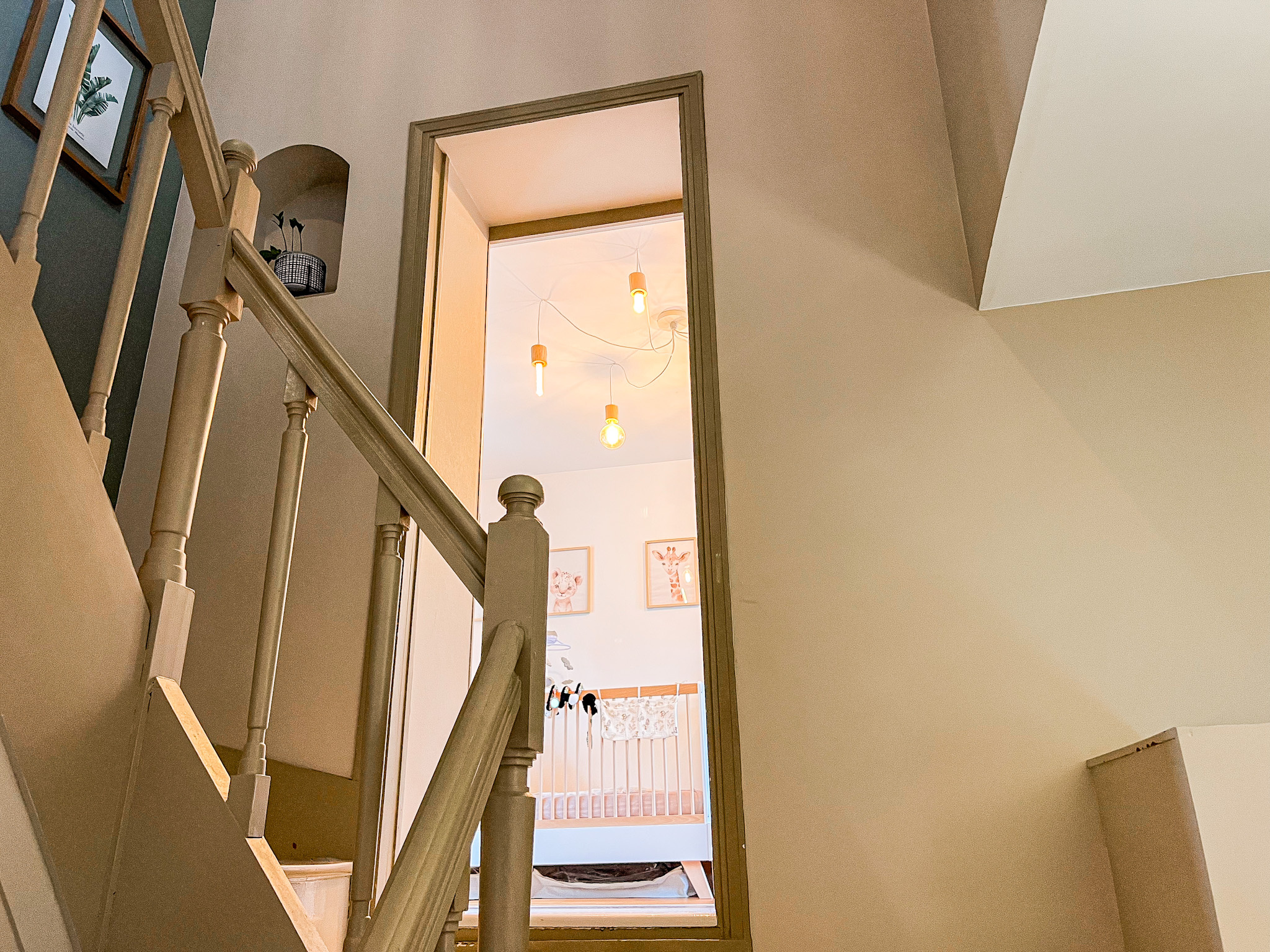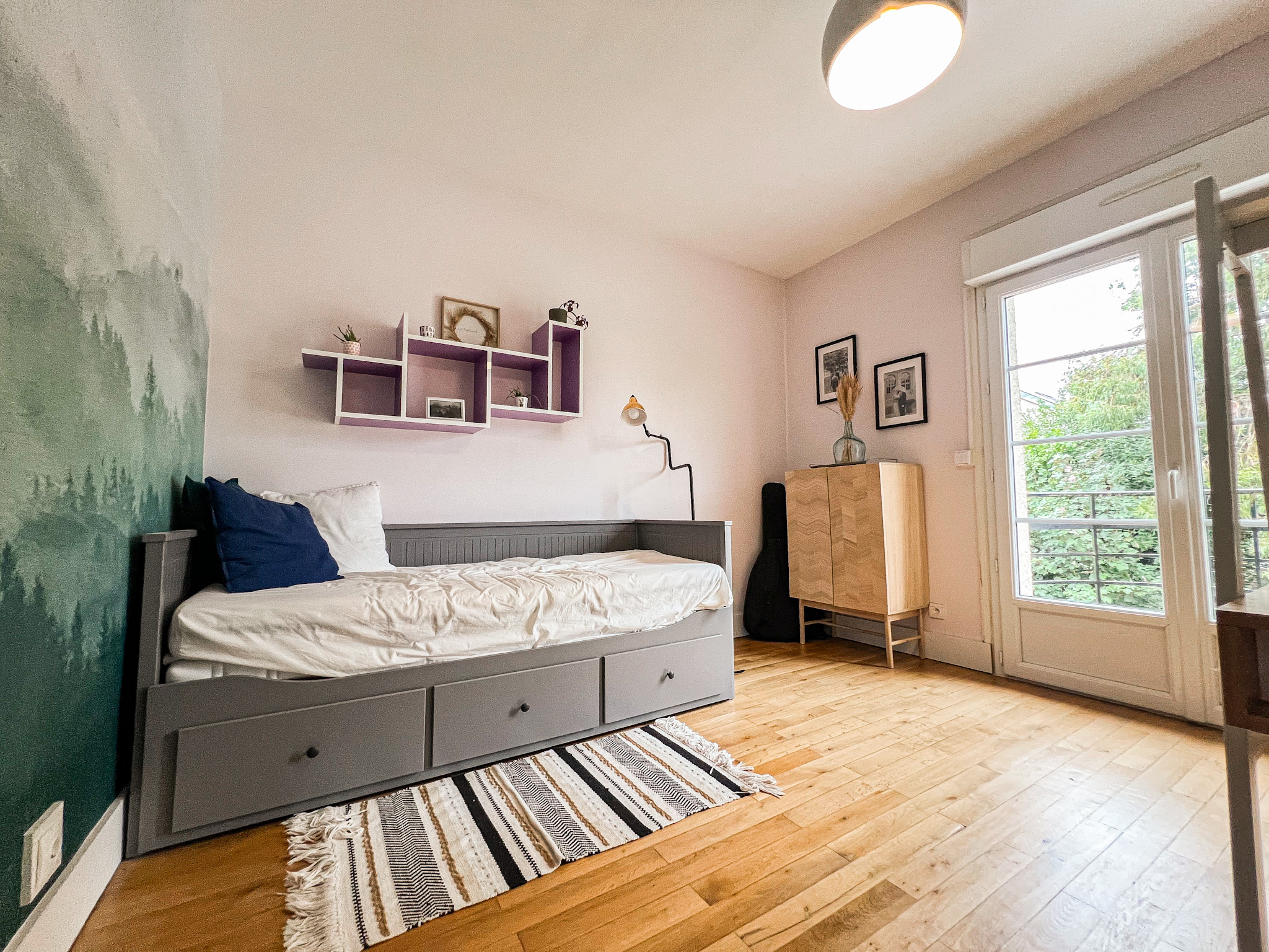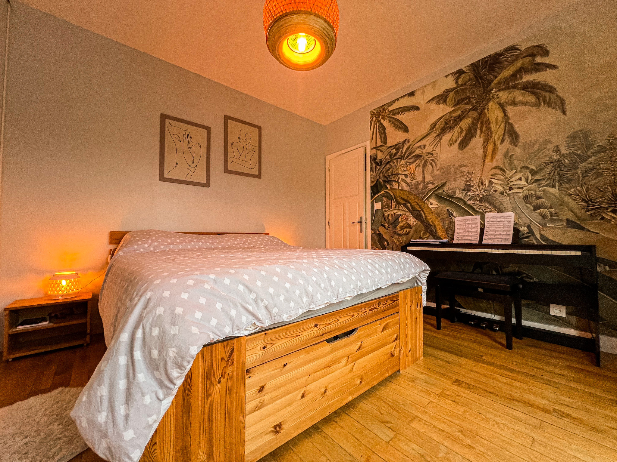 À mi-étage, une première chambre traversante au parquet parfaitement conservé.À l'étage supérieur, deux chambres lumineuses se partagent une salle d'eau rénovée où le charme rétro des années 60 s'harmonise avec des finitions contemporaines, offrant un style unique et plein de personnalité. Un coin bureau, réalisé sur mesure avec une élégante séparation en bois, complète l'espace.