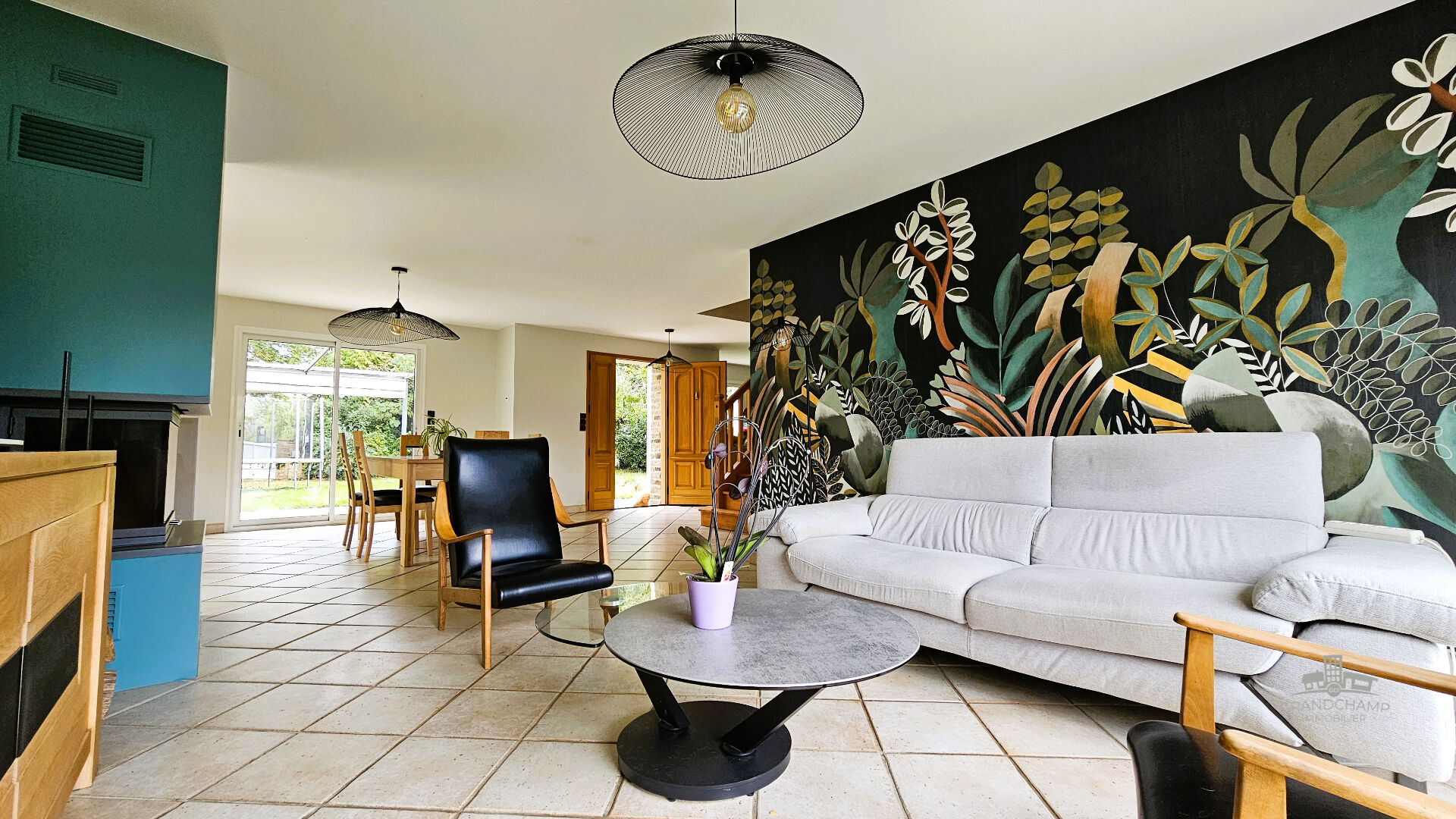 Un salon-séjour traversant très lumineux grâce à sa triple exposition Nord-Sud-Ouest) et équipé d'une cheminée à insert de 2023