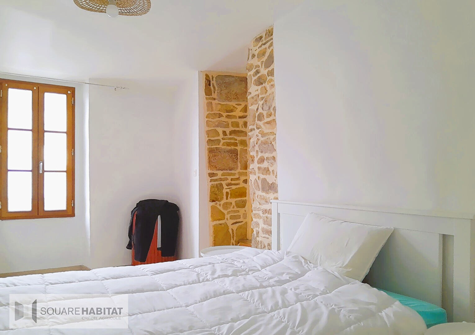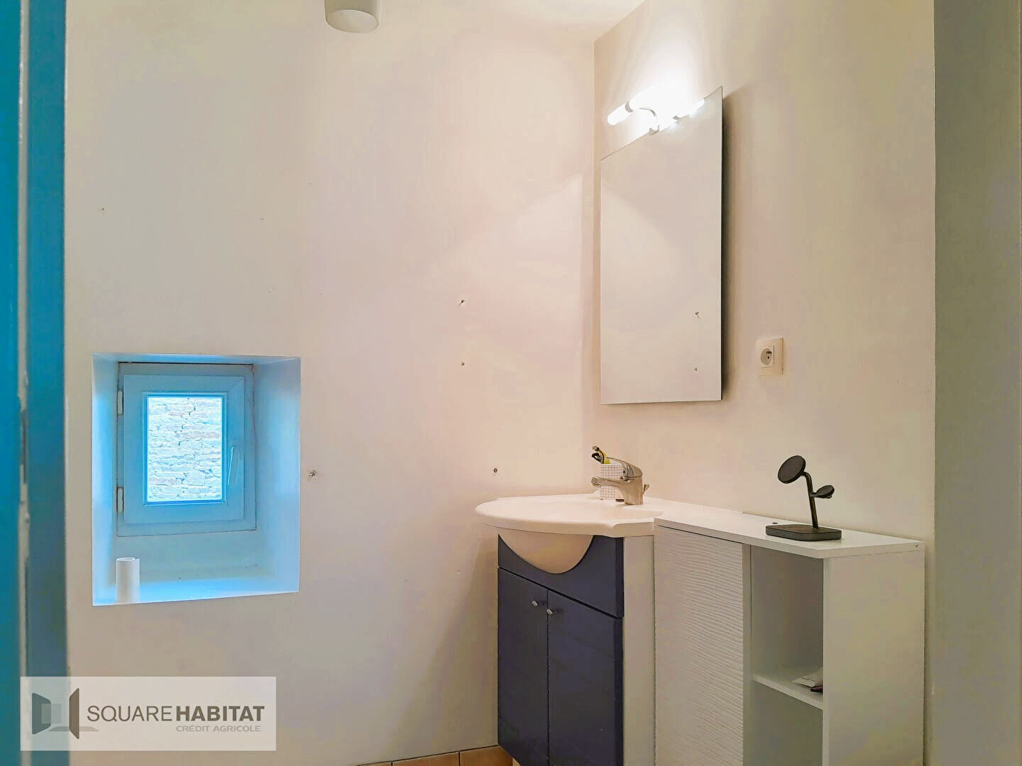 Il est composé d'une entrée avec placard, une cuisine semi-ouverte sur un salon séjour où les poutres apparentes et les murs en pierre soulignent le caractère historique du lieu...