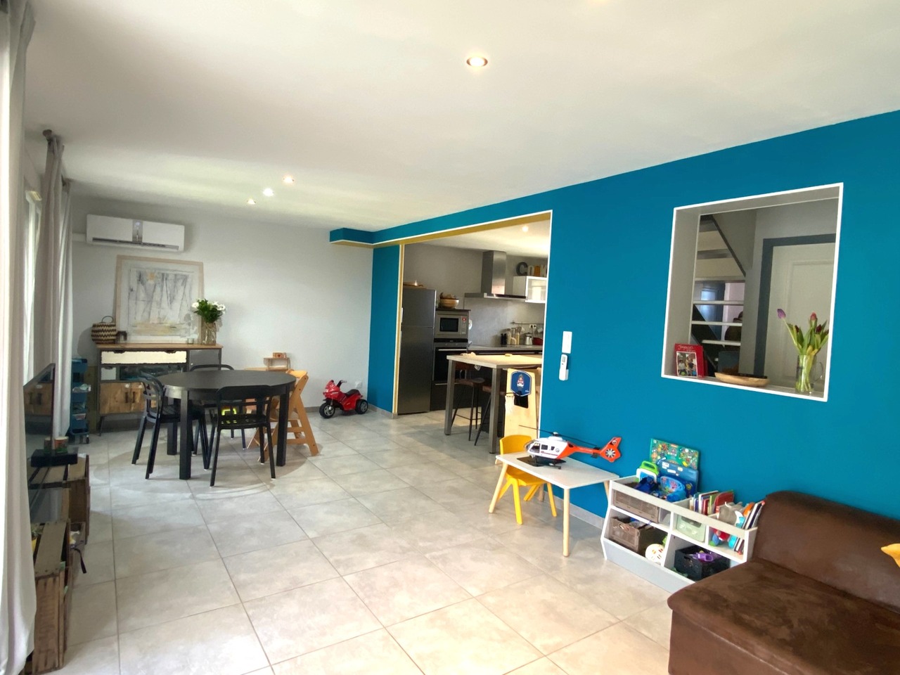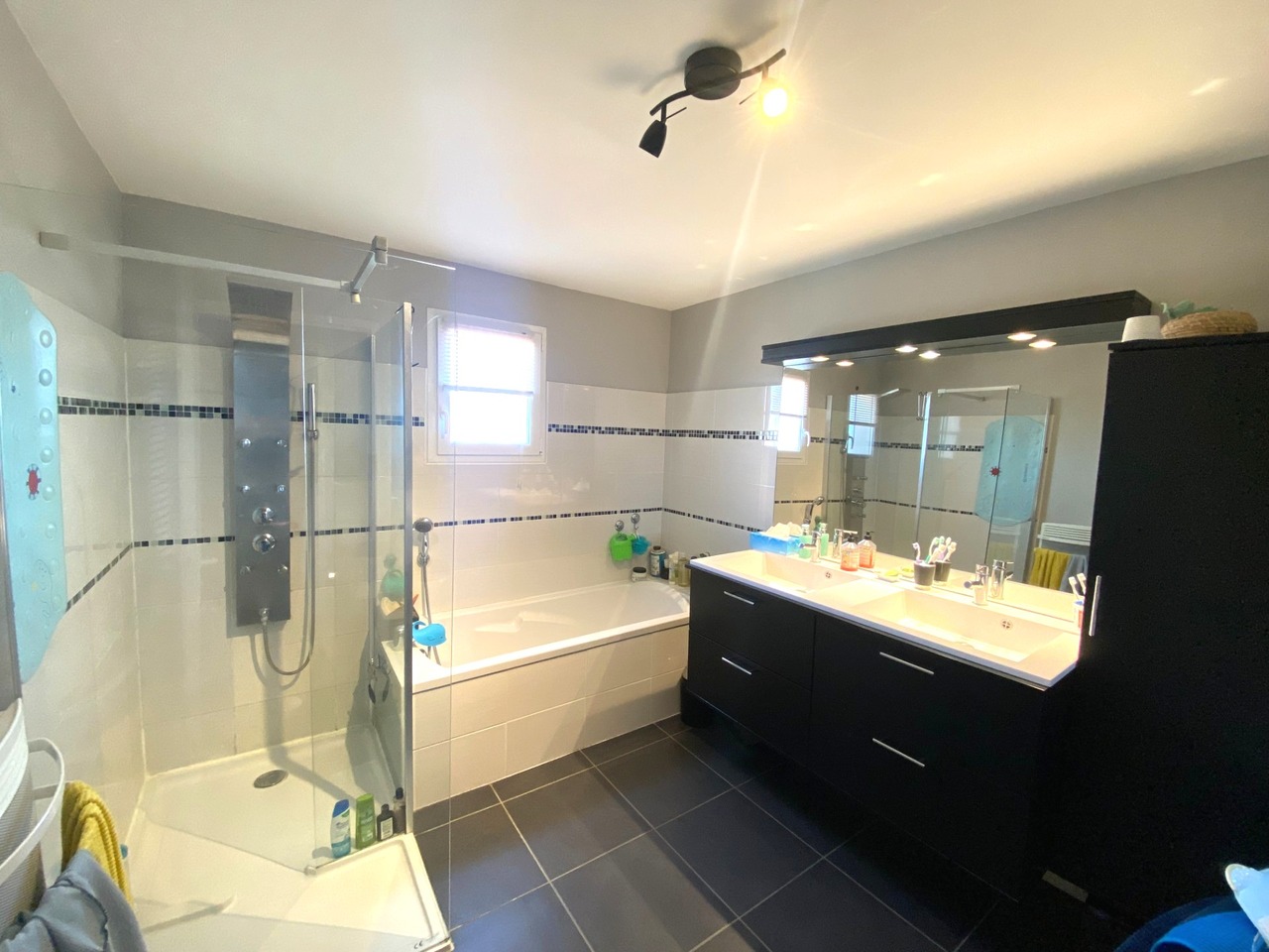 Villa récente T4 de 104m² en R+1 libre sur 2 faces, grande pièce de vie, belle cuisine équipée, 3 chambres avec placard, salle de bain + douche, véranda et jardin, parking extérieur. Garage modifié en buanderie et cellier. Bon équipement, climatisation, menuiseries PVC.