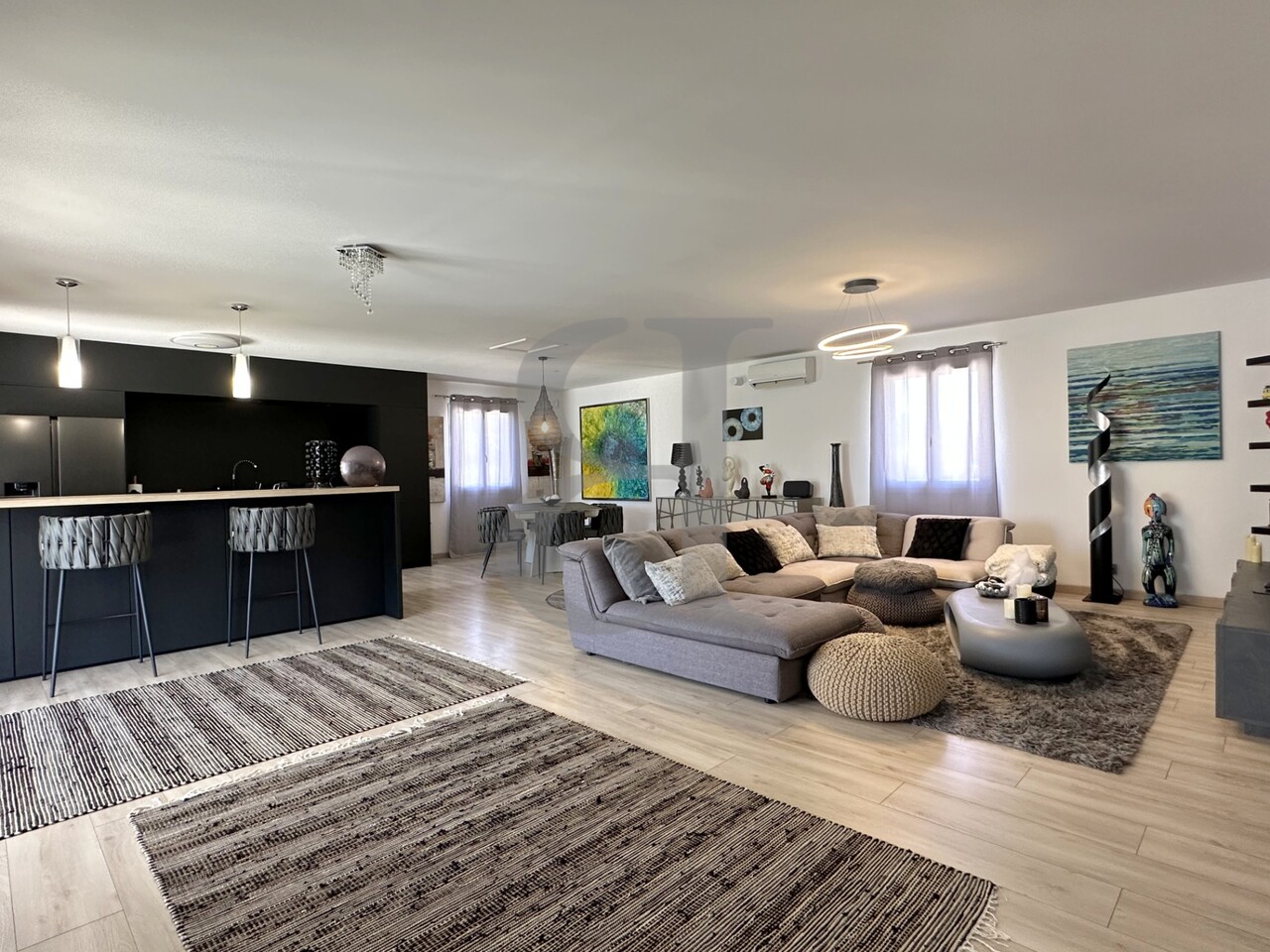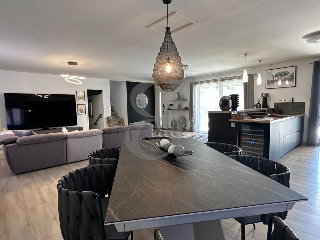 Dès l’entrée, les grandes baies vitrées inondent de lumière un vaste séjour ouvert sur la salle à manger et la cuisine équipée design, créant un espace de vie convivial et élégant.