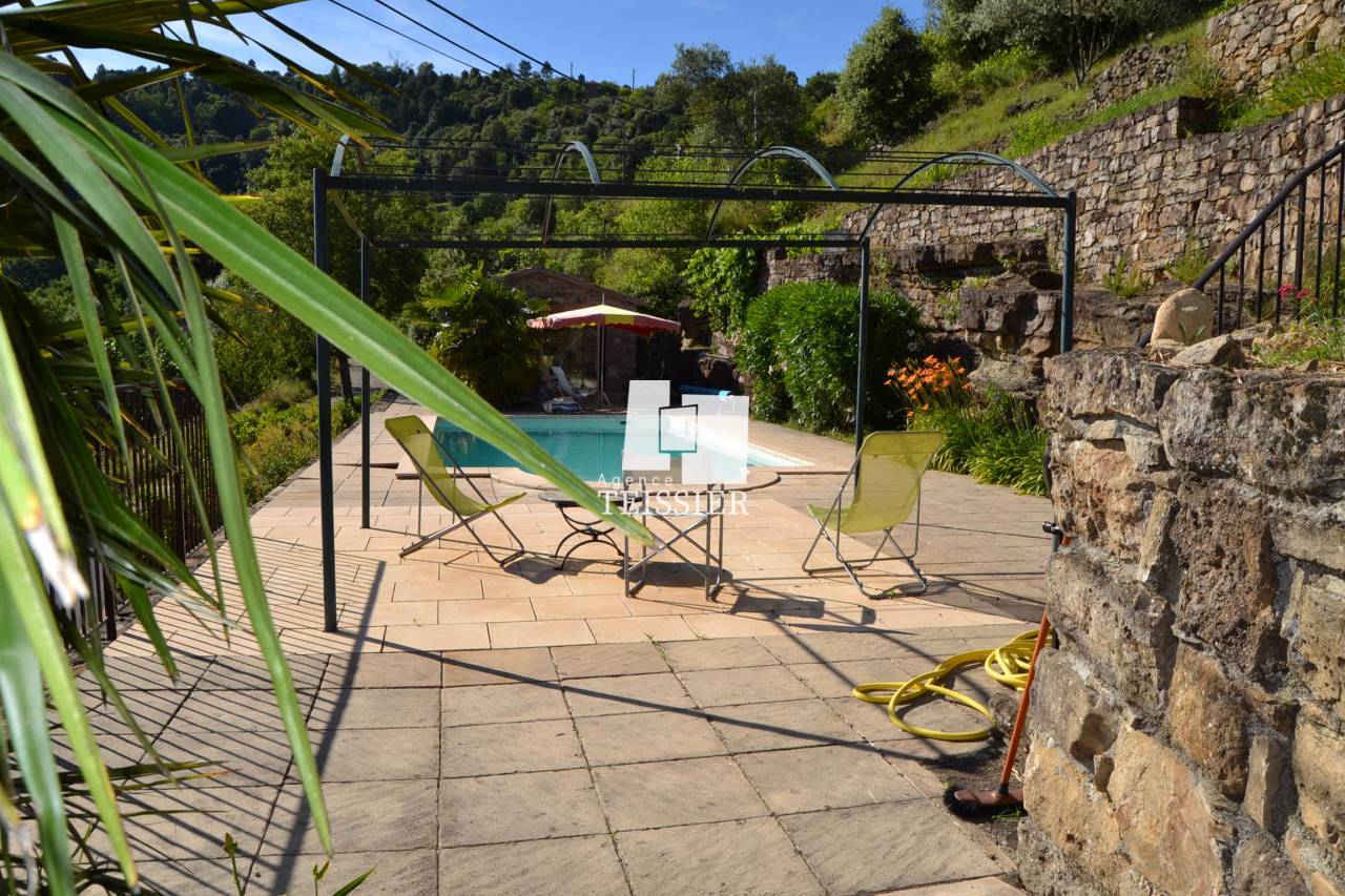 A flanc de colline sud, au calme et à moins de 10 min Des Vans, cette propriété pour partie du XVIIéme a été entièrement restaurée avec goût. Elle se compose d'une partie principale d'environ 150 m², d'un gîte (deux chambres, séjour, cuisine) et d'une annexe (deux chambres, salle d'eau/wc). Environ 2,8 hectares de terres avec une oliveraie (production d'environ 180 kg), deux sources, piscine, idéal maison de famille.