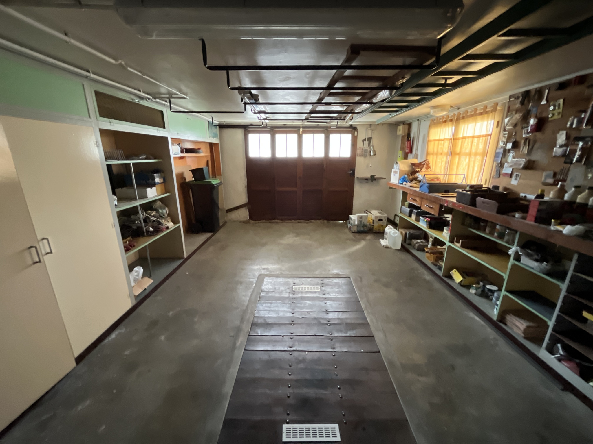 l'entrée se fait au rez de jardin (au niveau du sous sol) donnant dans un hall, une buanderie, une pièce de stockage (bureau ou chambre), un couloir donnant accès à l'arrière du jardin et un garage avec sa fosse mécanique transformée en cave à vin,