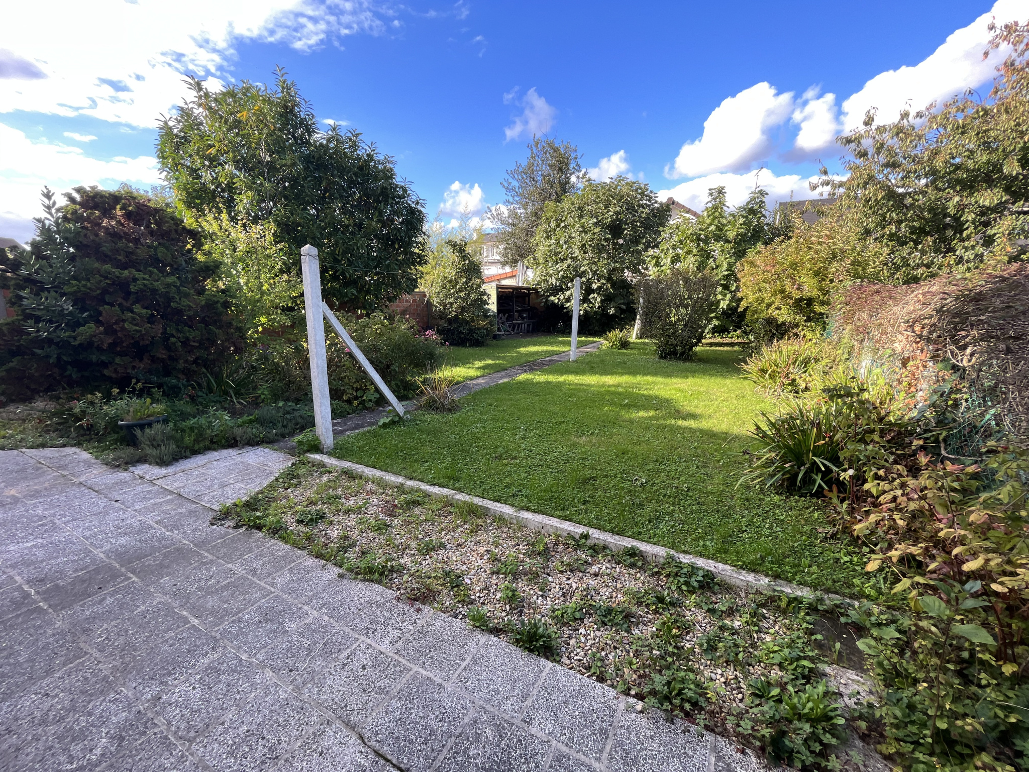 Un jardin tout autour de la maison avec un espace terrasse, la maison est non mitoyenne mais elle est néanmoins en limite de propriété d'un côté.